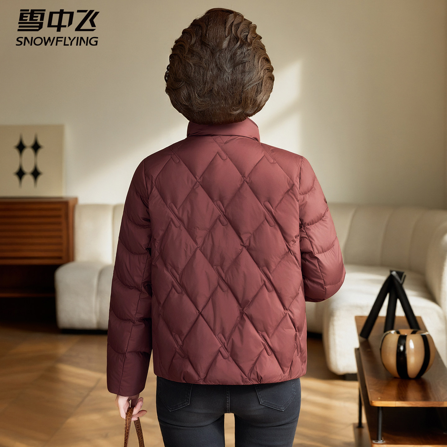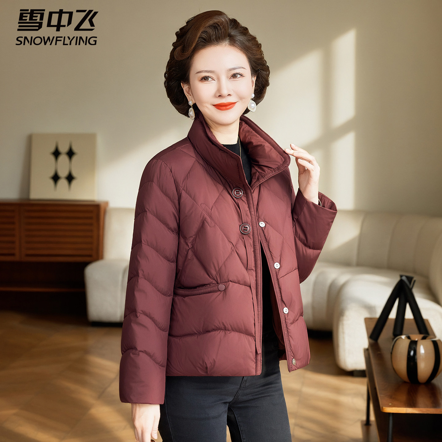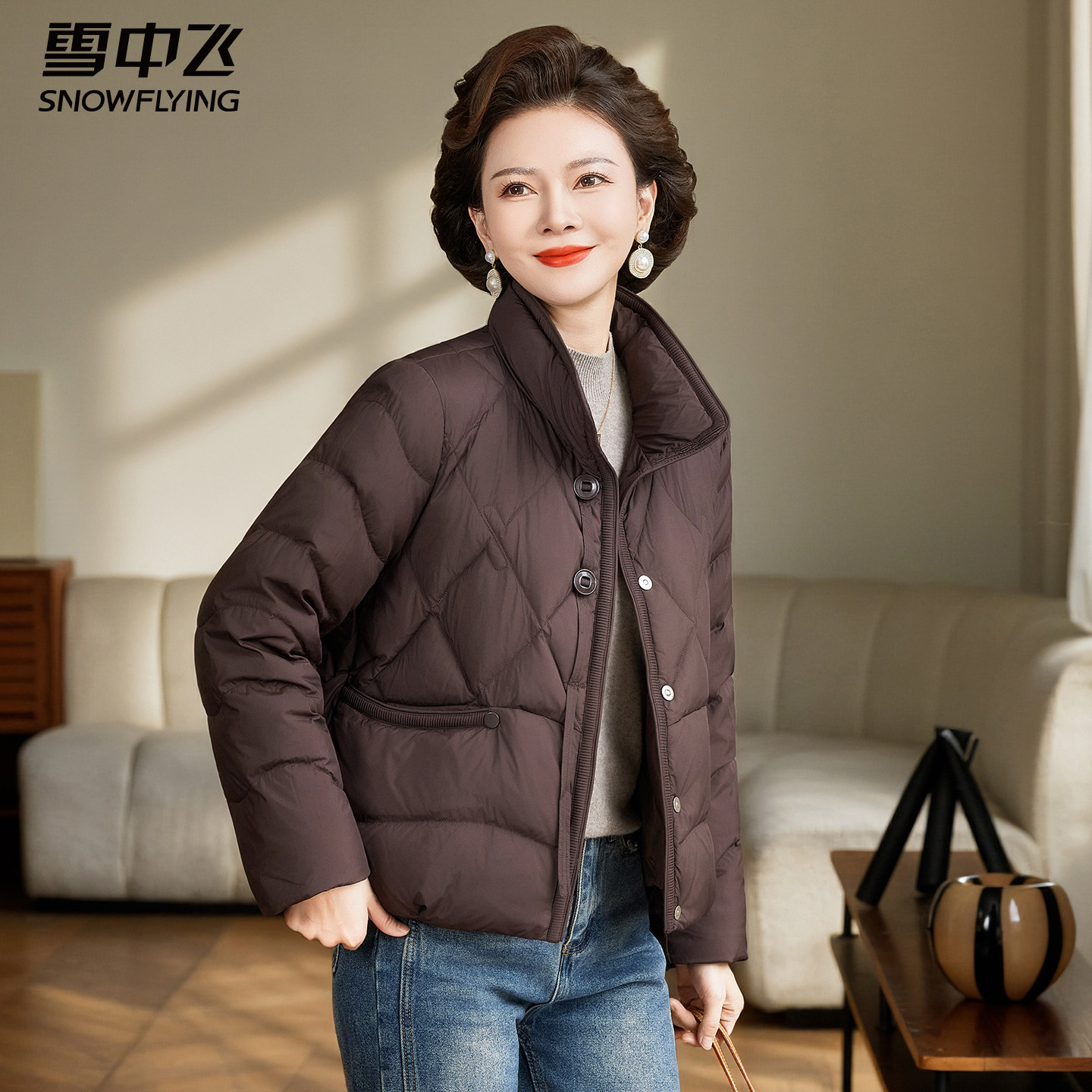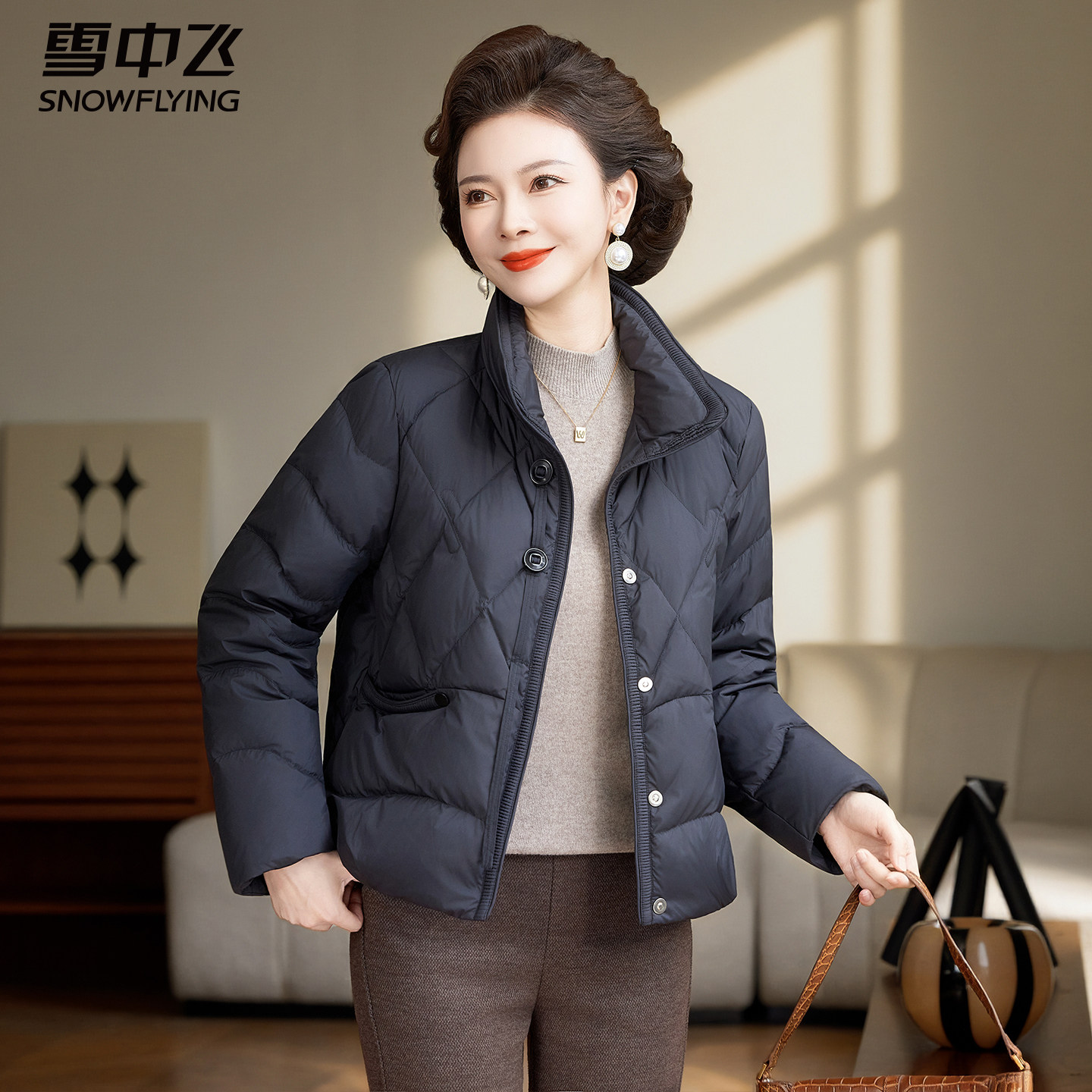 雪中飞短款羽绒服女轻薄中年妈妈立领冬装中老年人秋冬季保暖外套