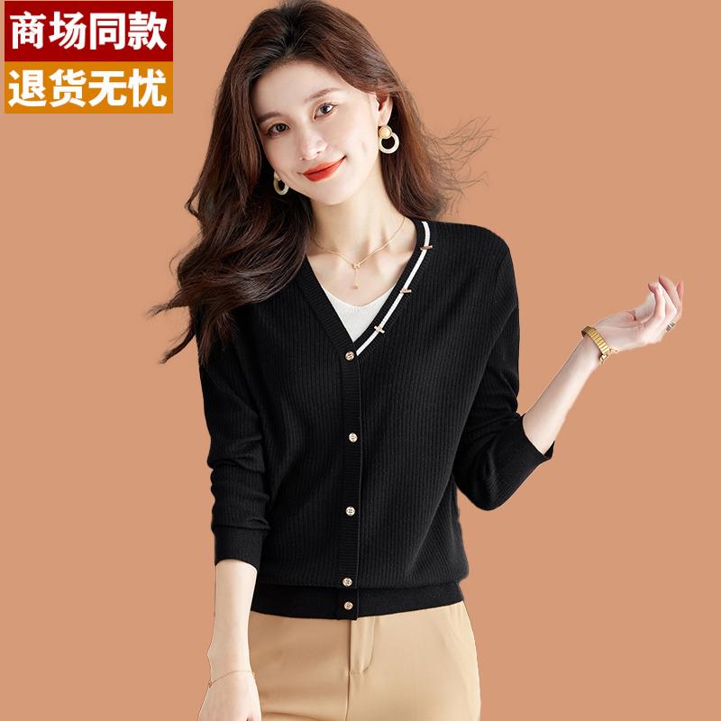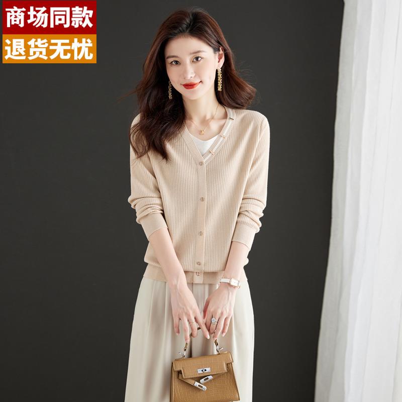 早秋羊毛V领针织衫女红色假两件开衫外套短款毛衣内搭上衣配裙子