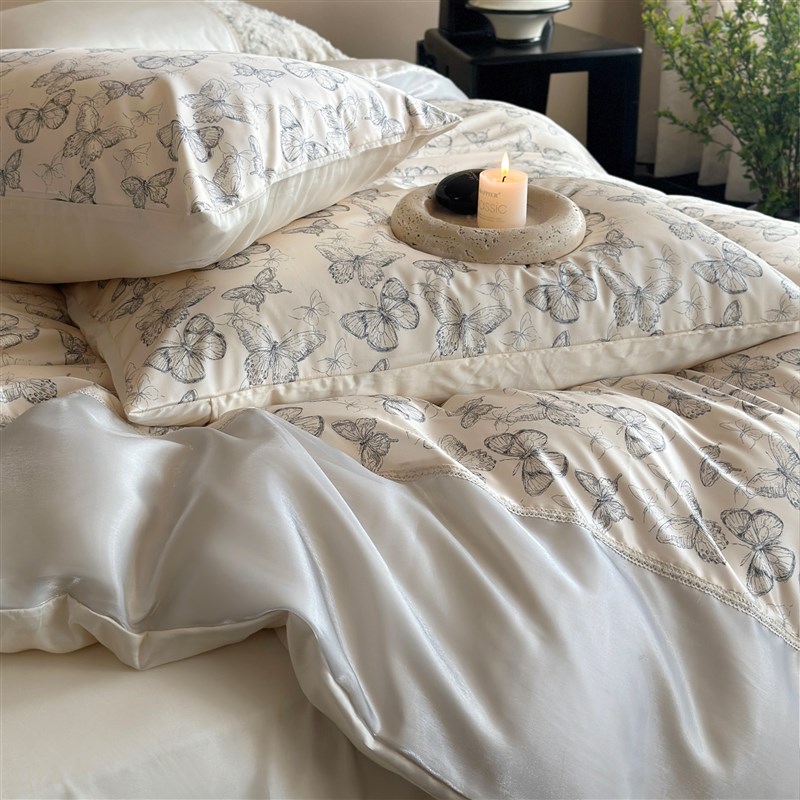 庄周梦蝶夏季凉感天丝蝴蝶印花四件套裸睡丝滑少女拼接被套床品