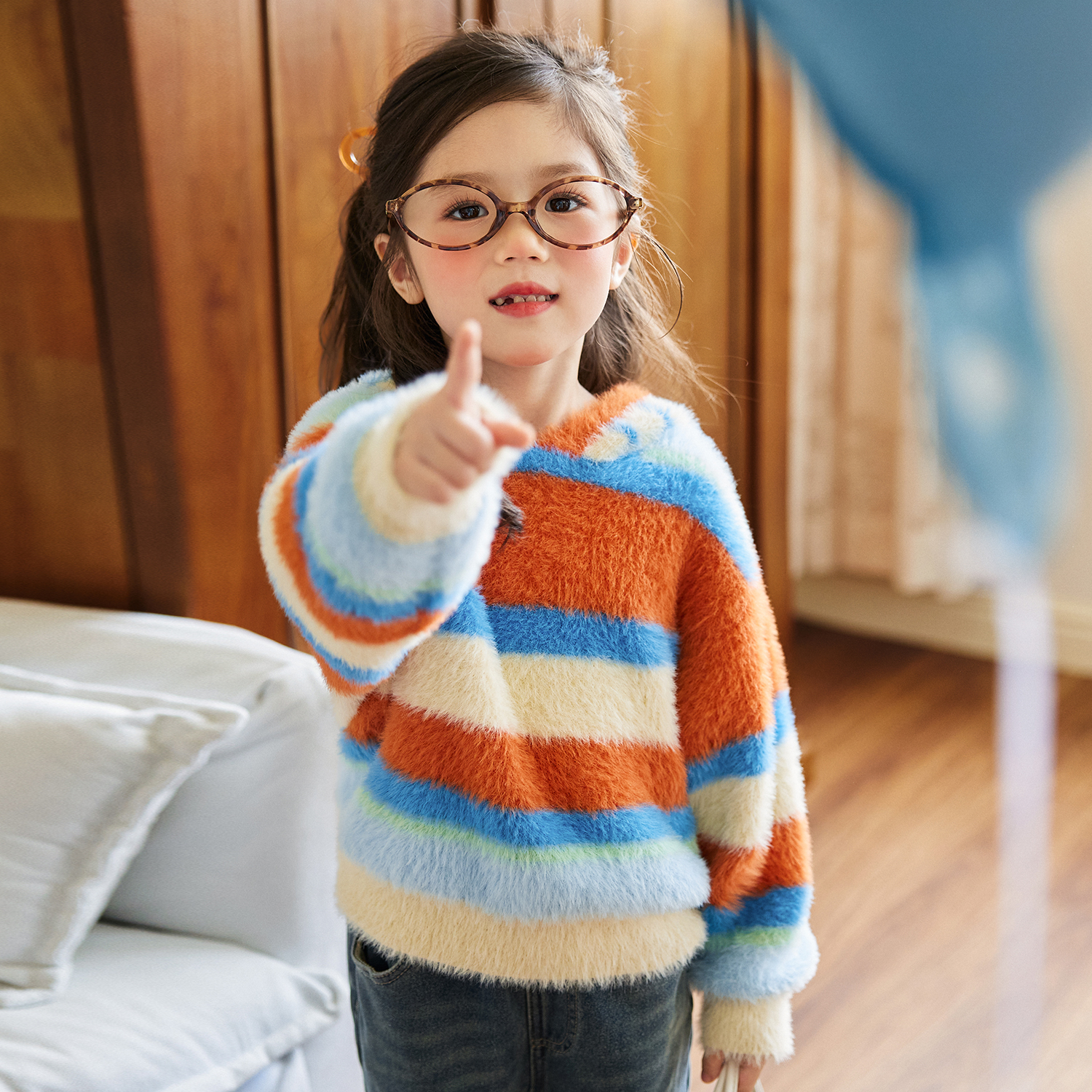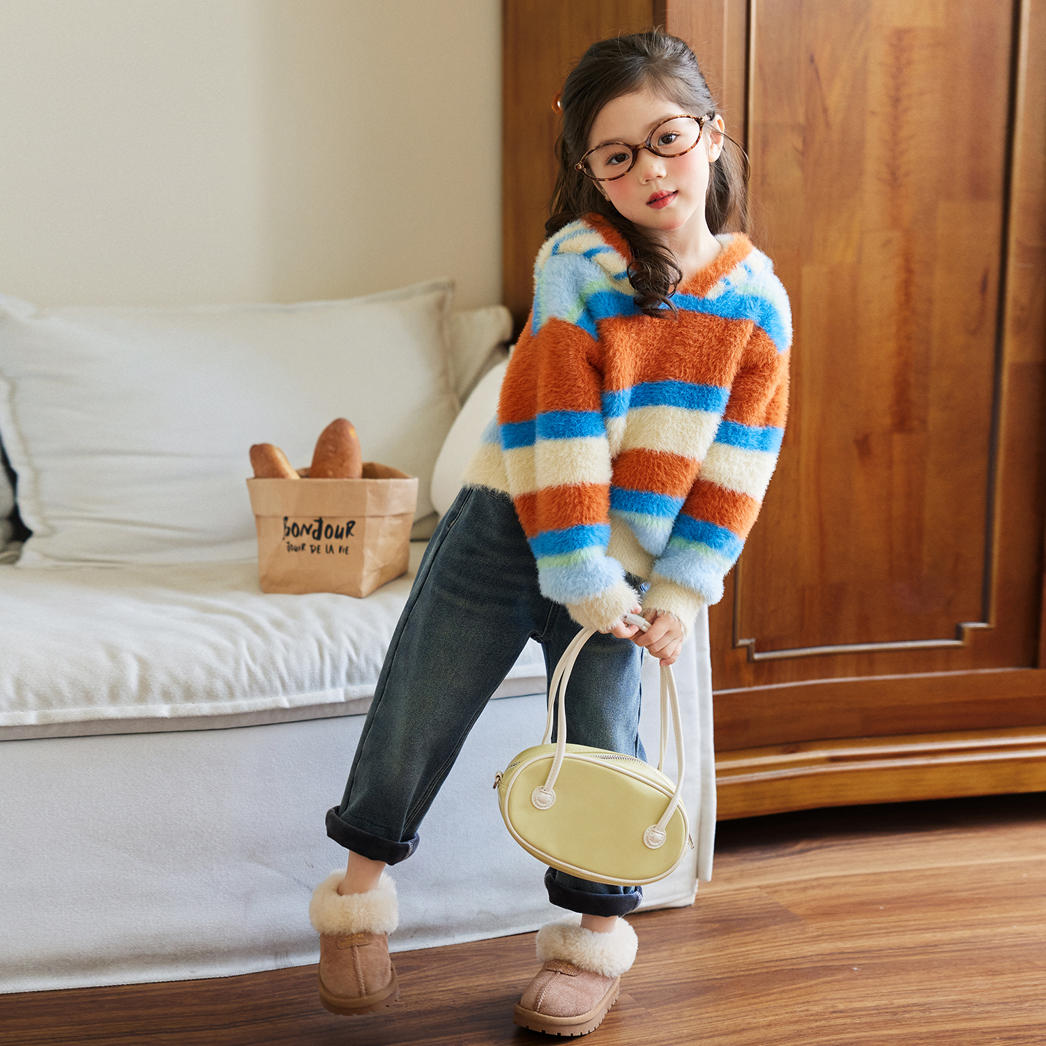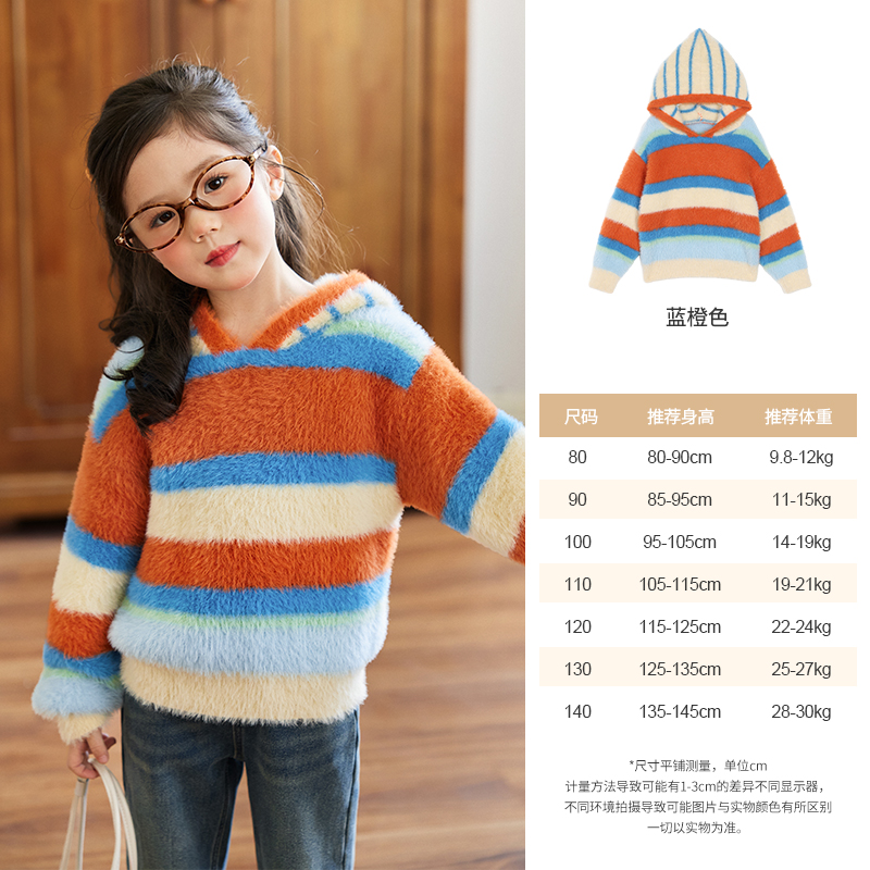 小O宝Okids童装宝宝连帽条纹毛衣女水貂毛2025冬装新款女童针织衫