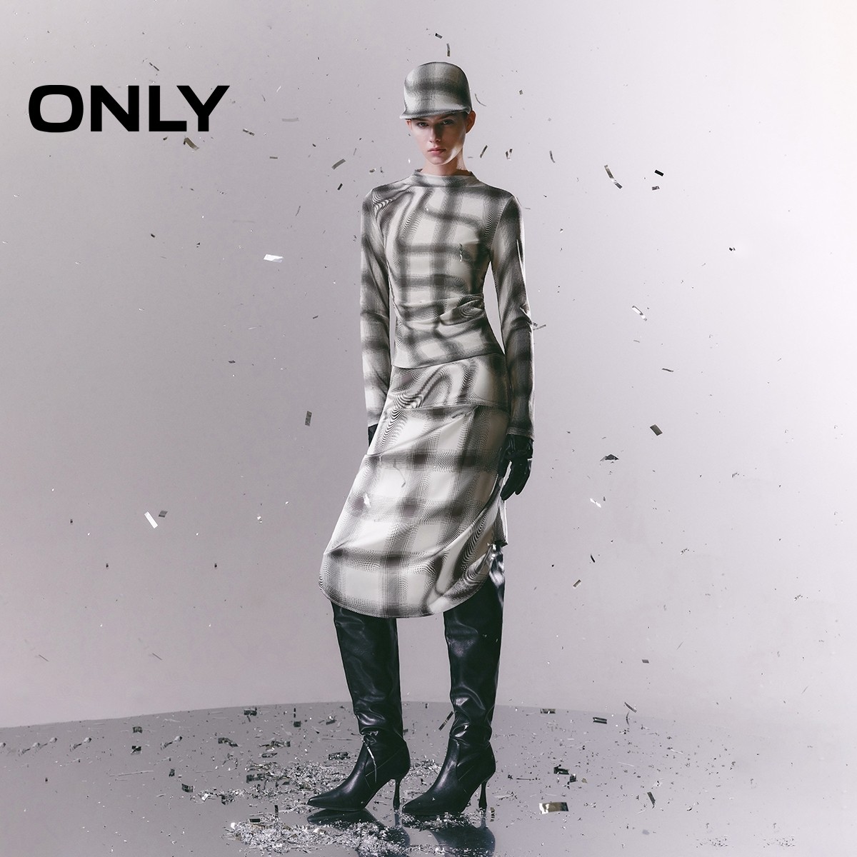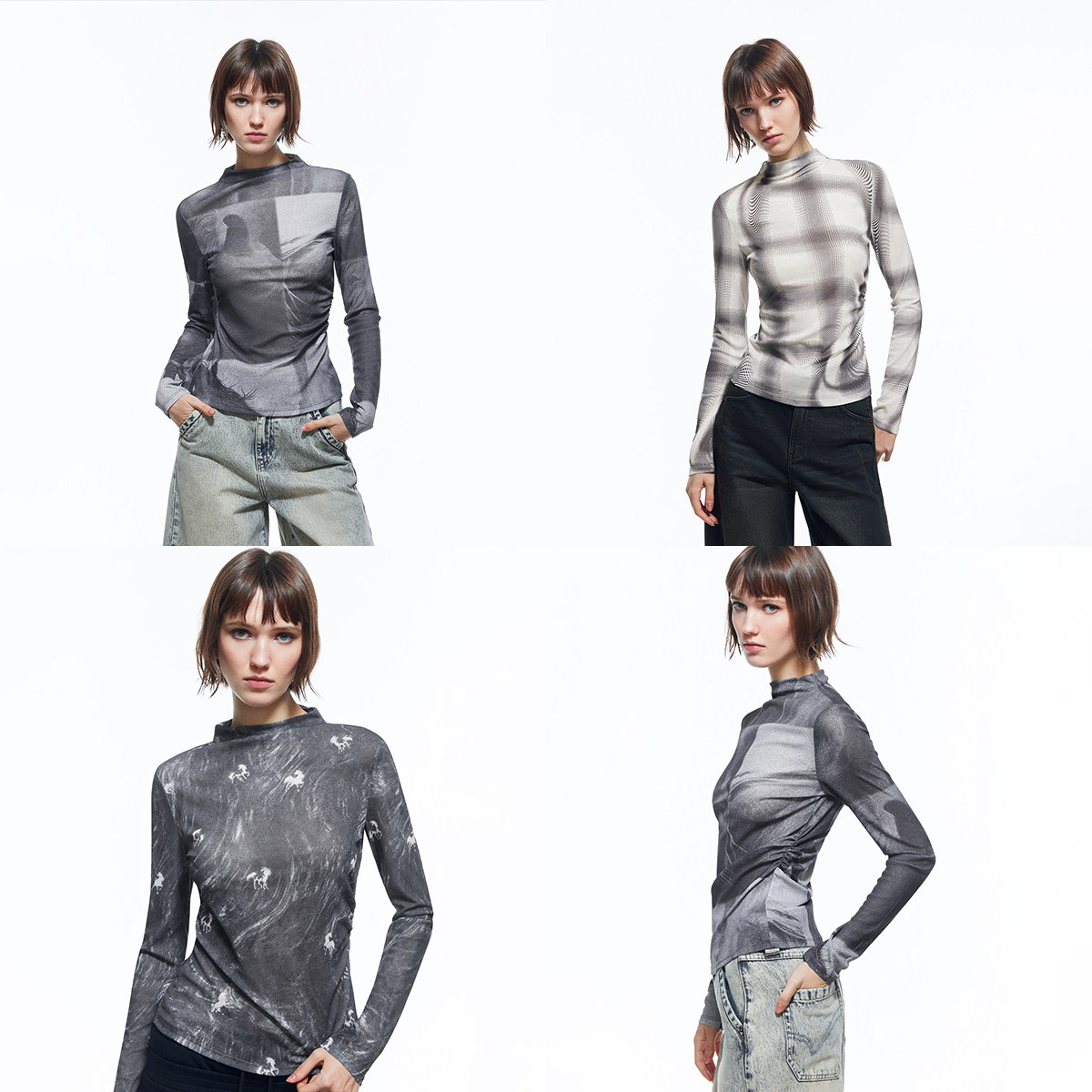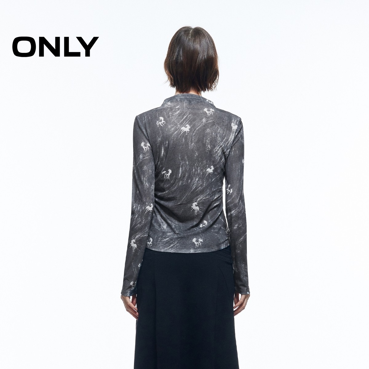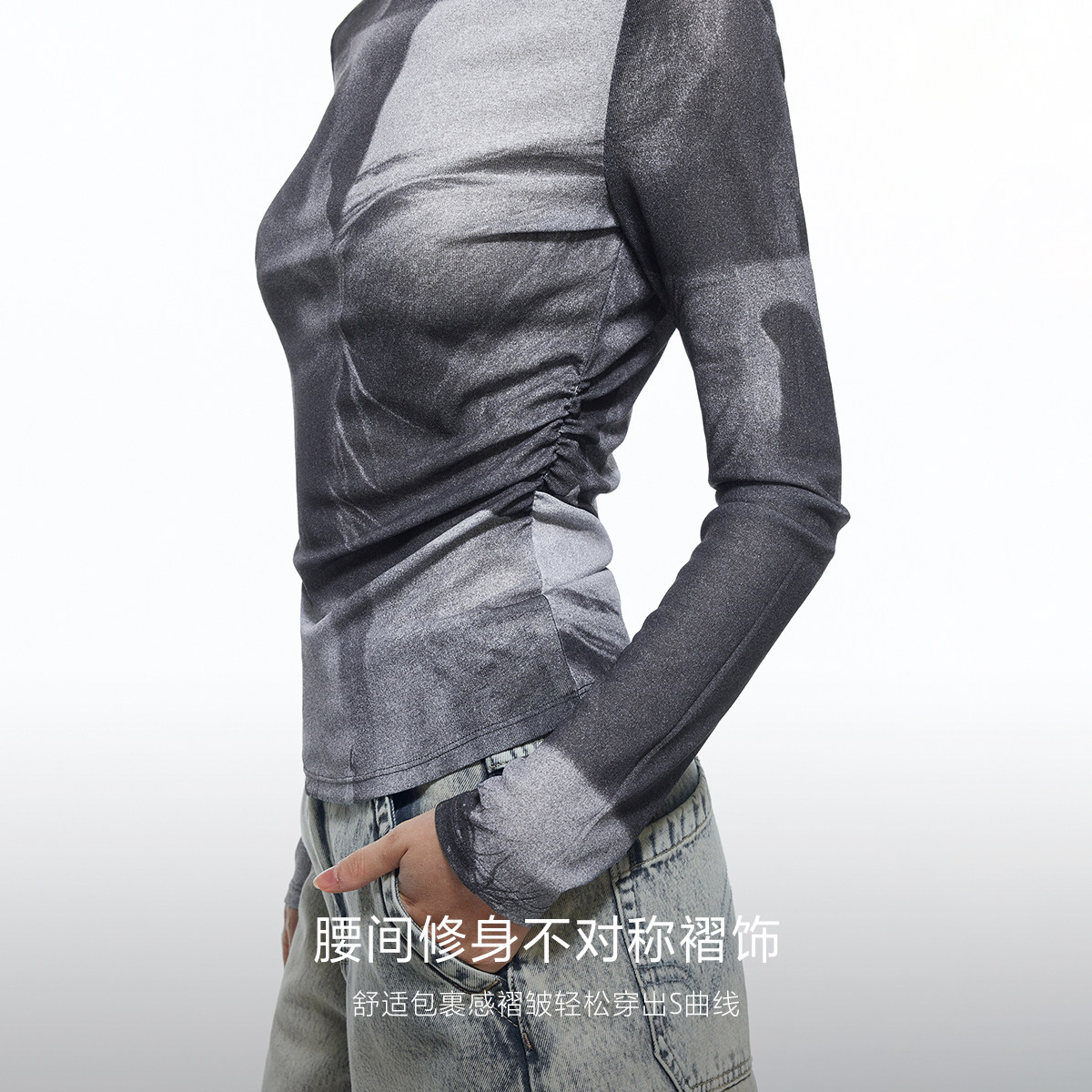 ONLY2026春季新款辣妹风轻薄网纱印花收腰捏褶修身高领正肩T恤女