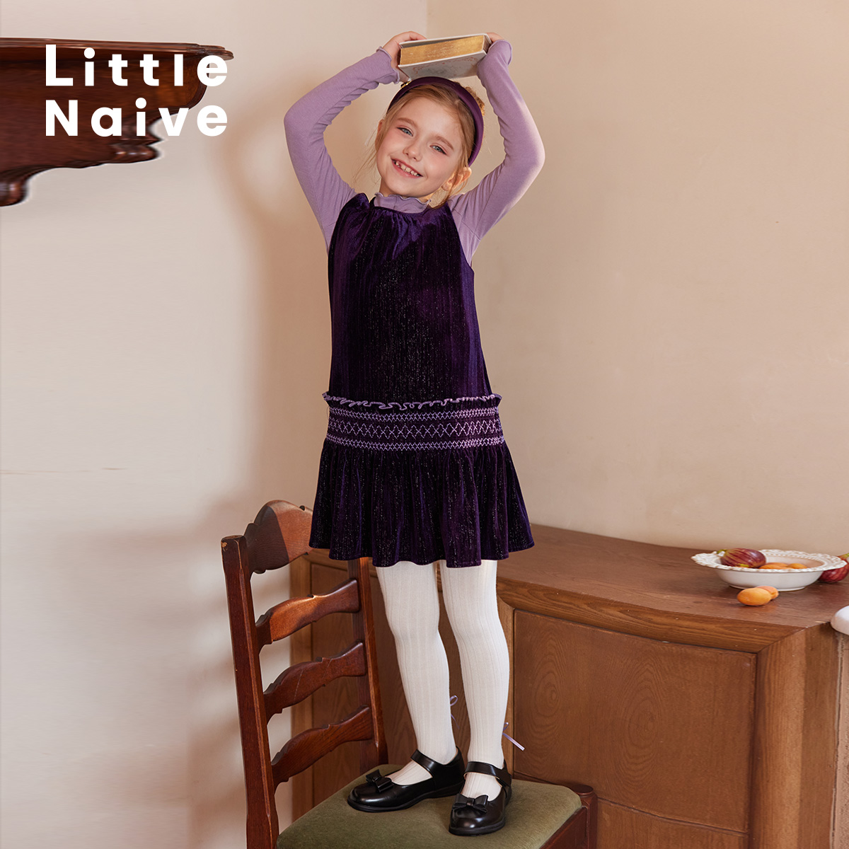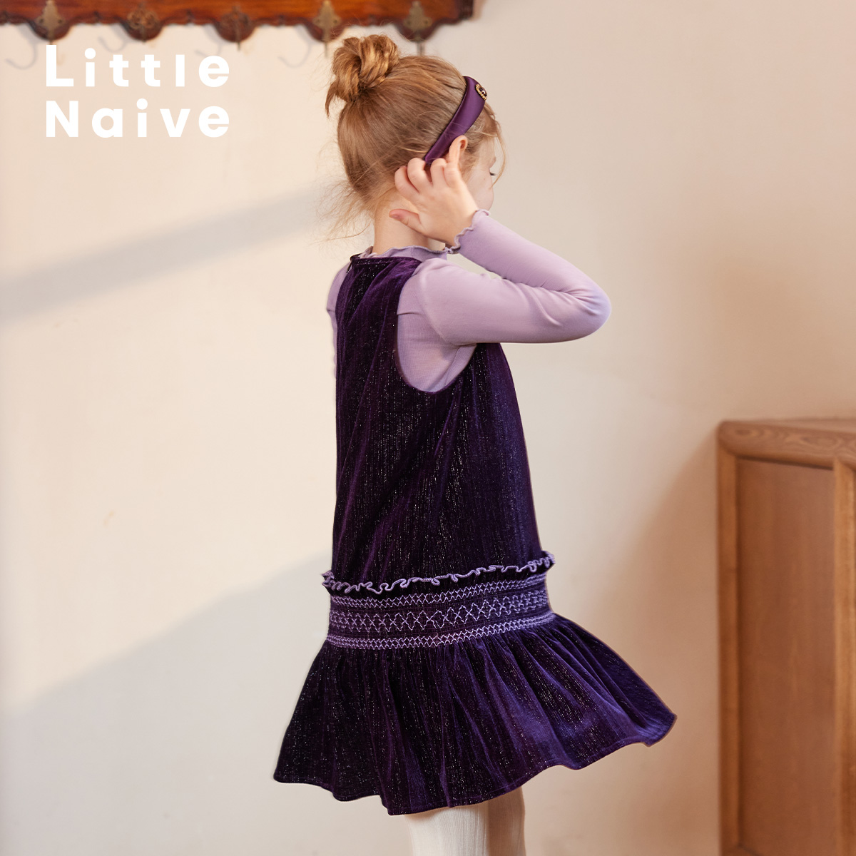 LittleNaive女童连衣裙秋季新款打揽洋气裙子儿童闪闪丝绒背心裙