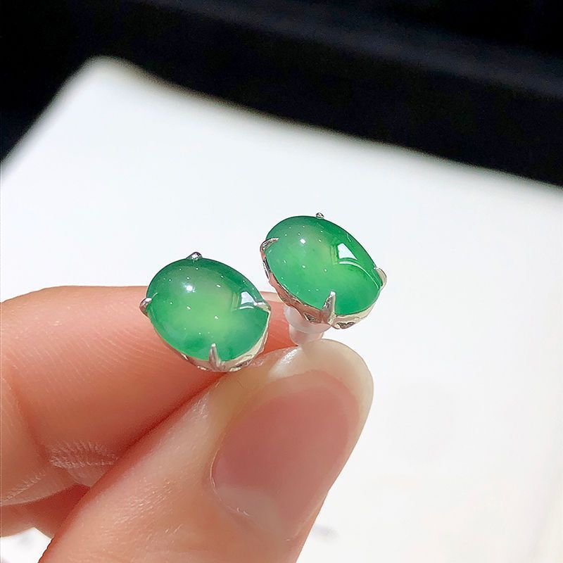老坑玉髓高冰种冰绿蛋面耳钉复古