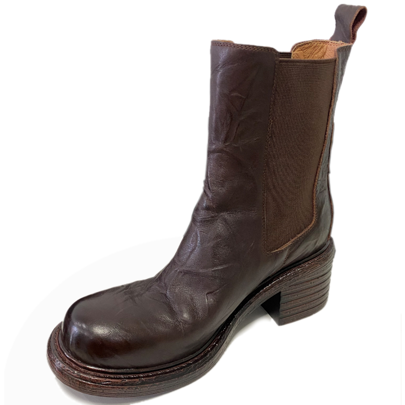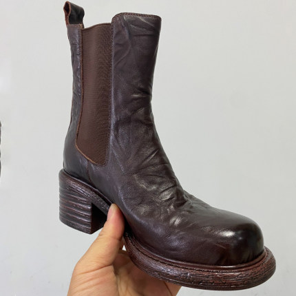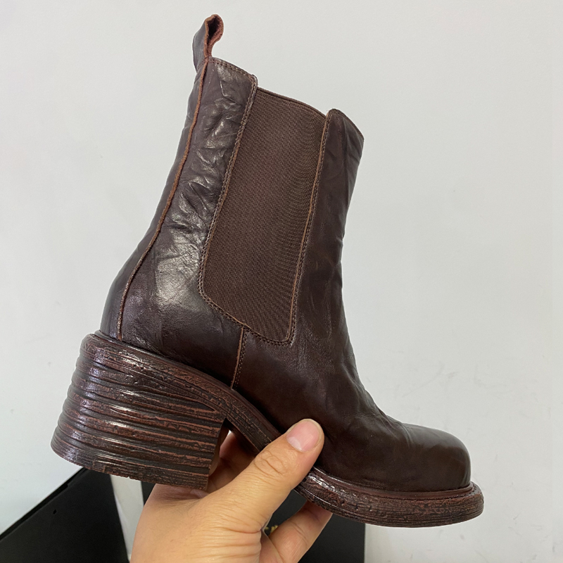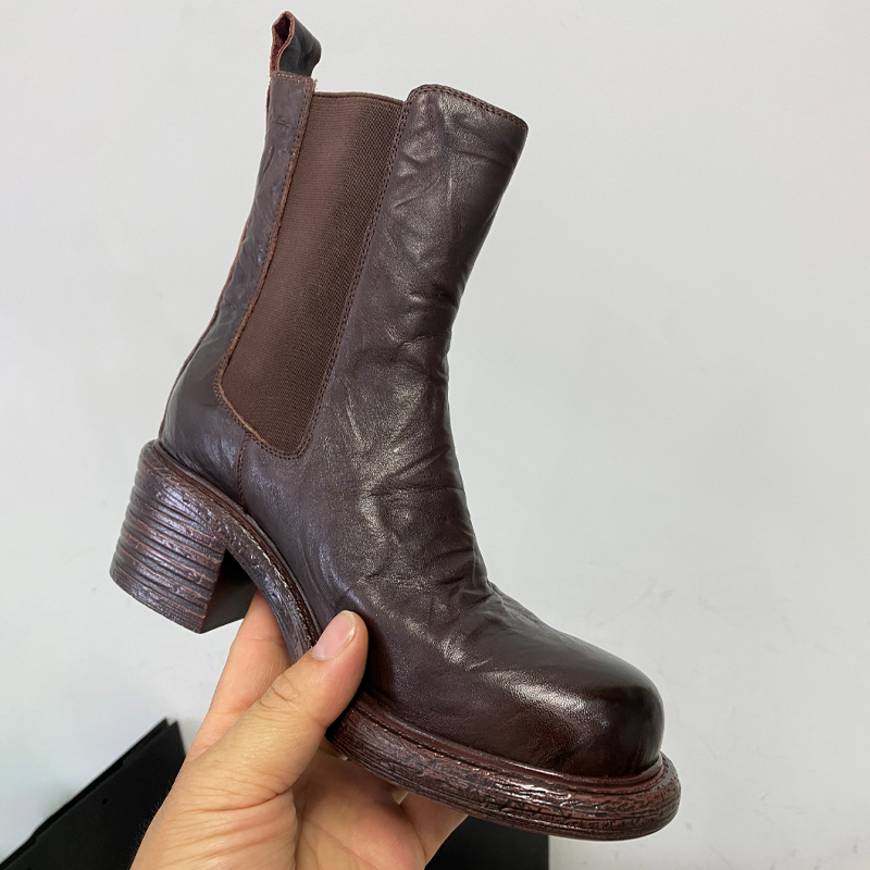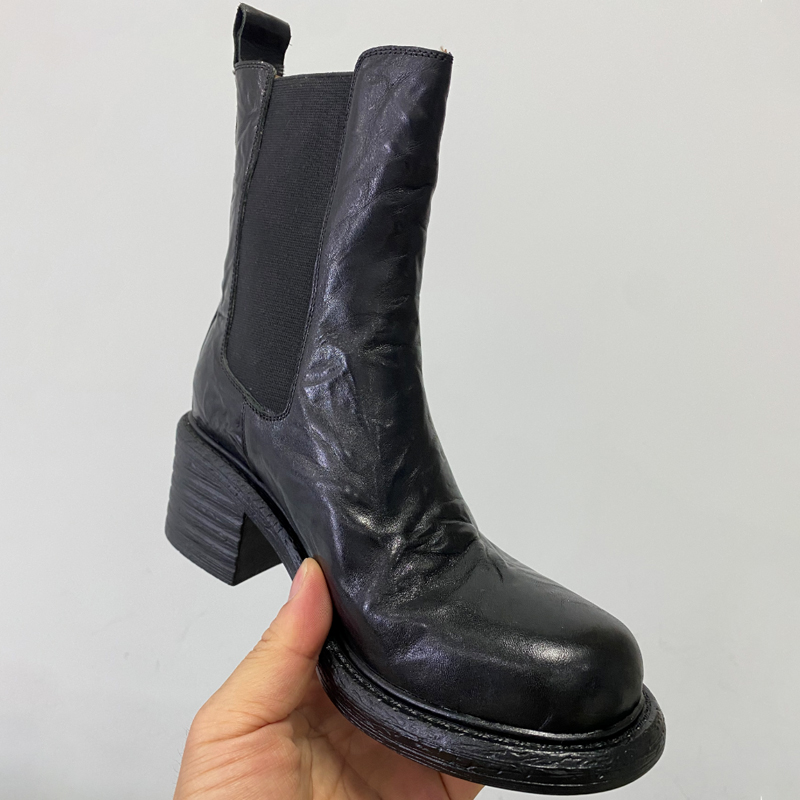 高端女靴纯手工固特异厚底切尔西靴粗跟高跟牛皮褶皱做旧马丁短靴