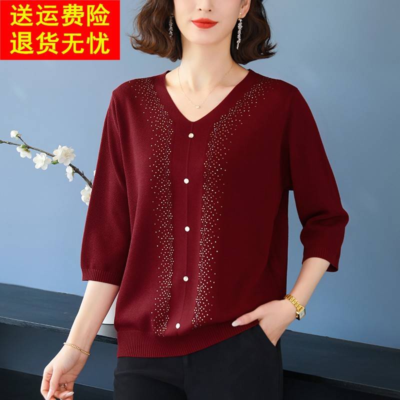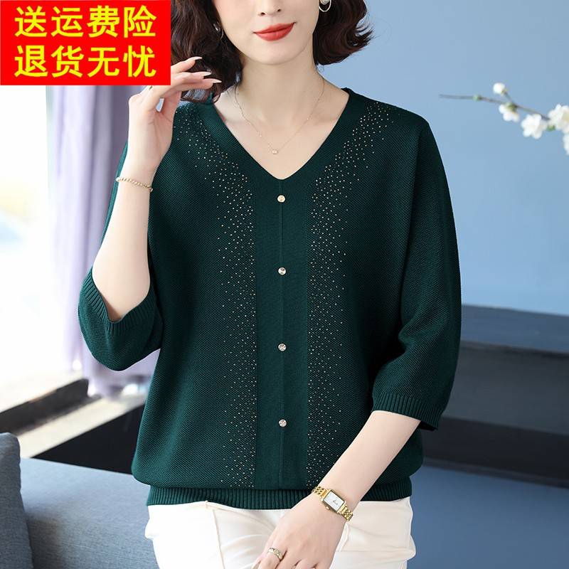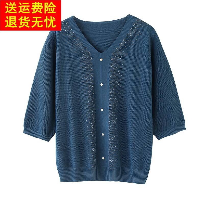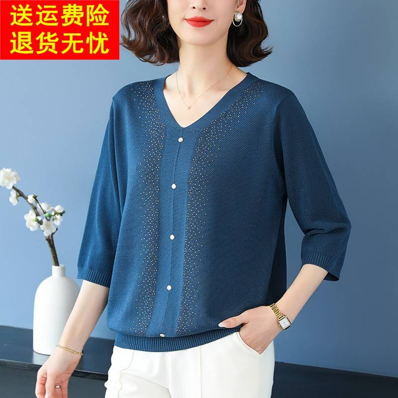 时尚妈妈装春夏七分袖冰丝t恤女V领宽松针织上衣特大码洋气打底衫