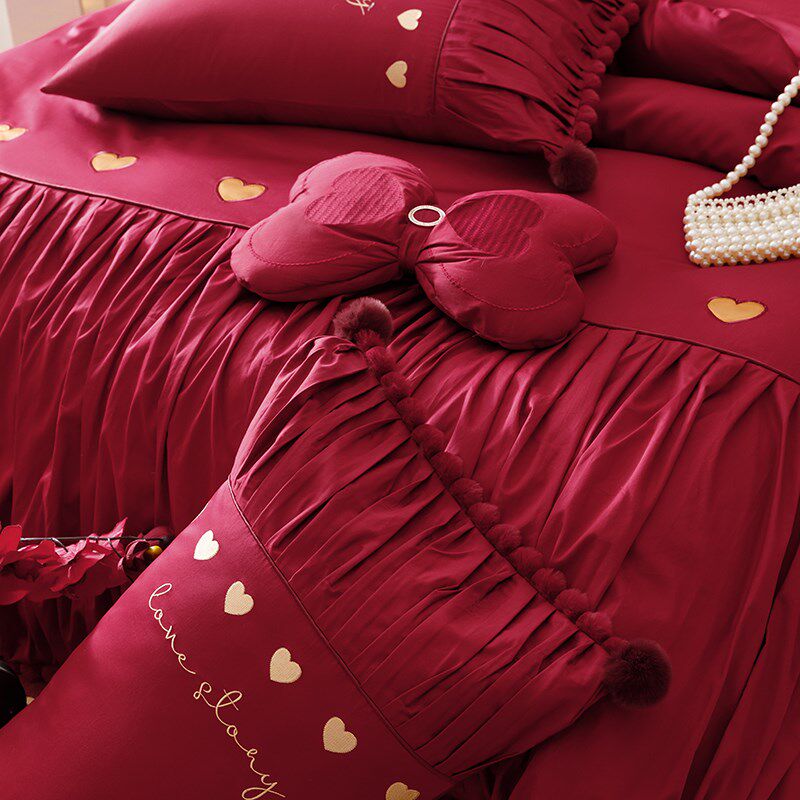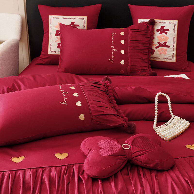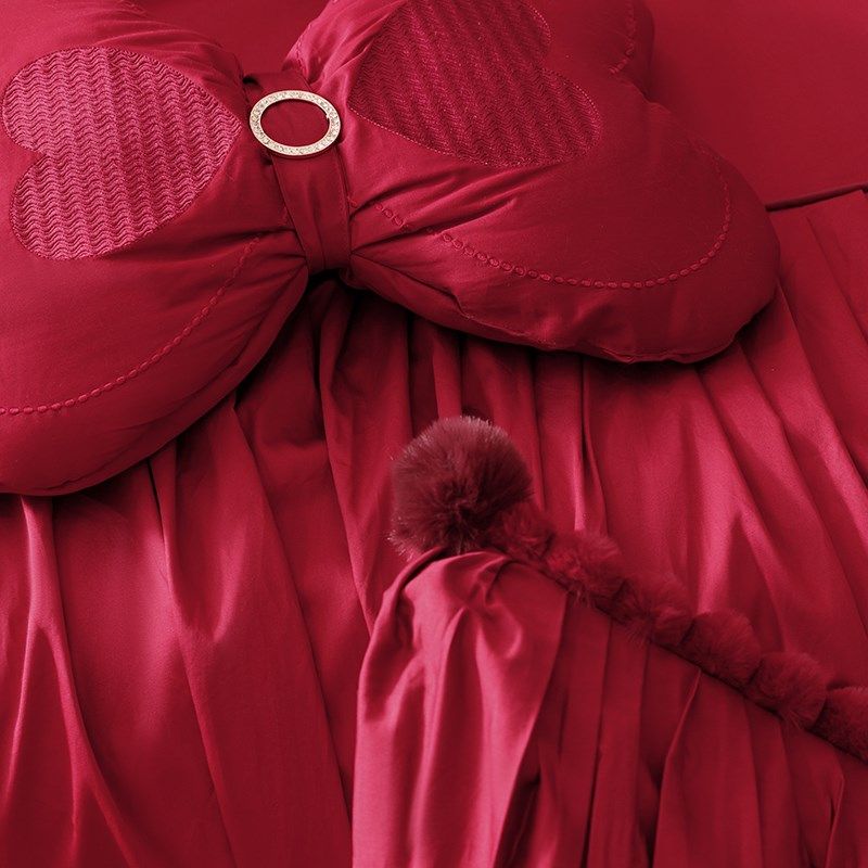 韩式少女心婚庆全棉四件套结婚床上用品大红色新婚床单喜被套