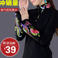民族风t恤女长袖秋季新款中国风女装绣花复古立领纯棉上衣打底衫