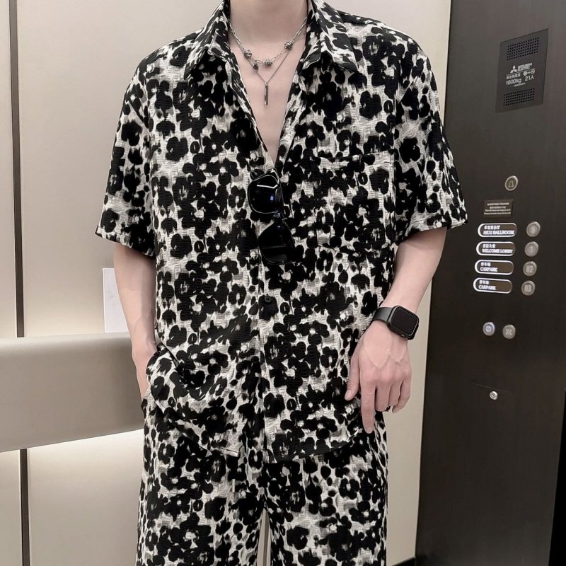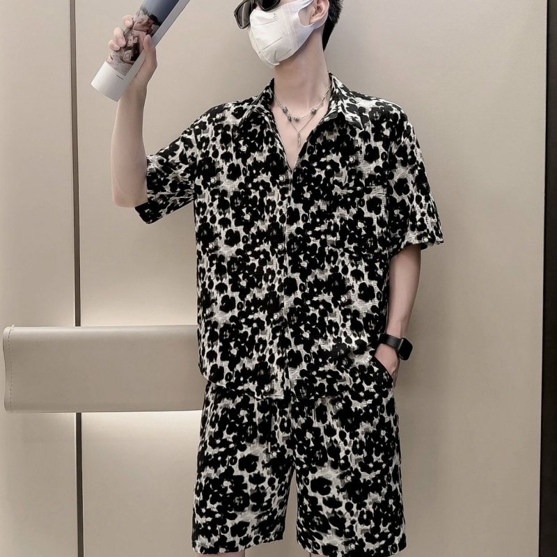 痞帅个性豹纹印花短袖衬衫套装