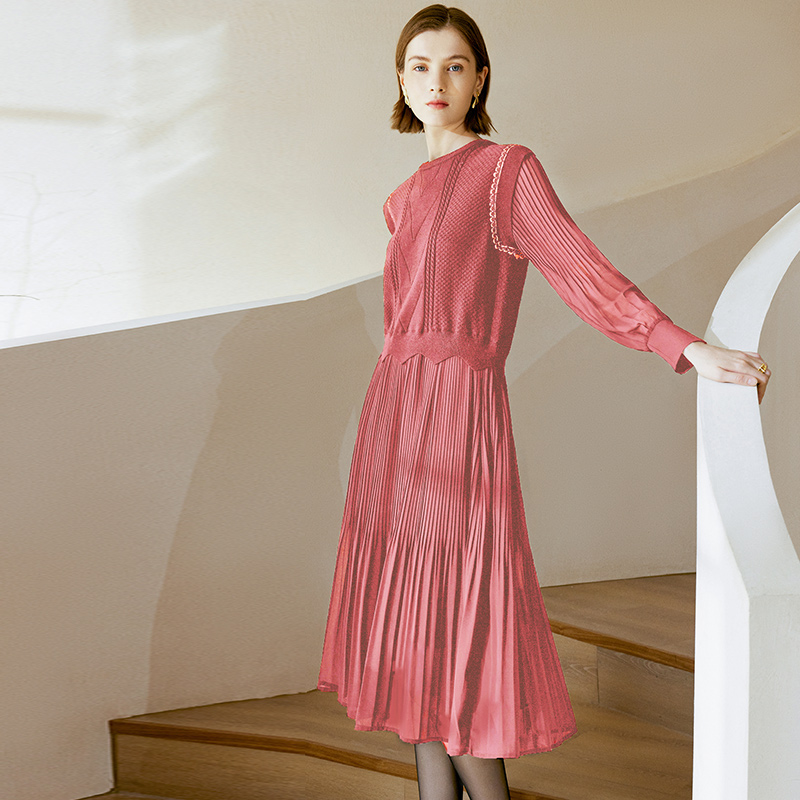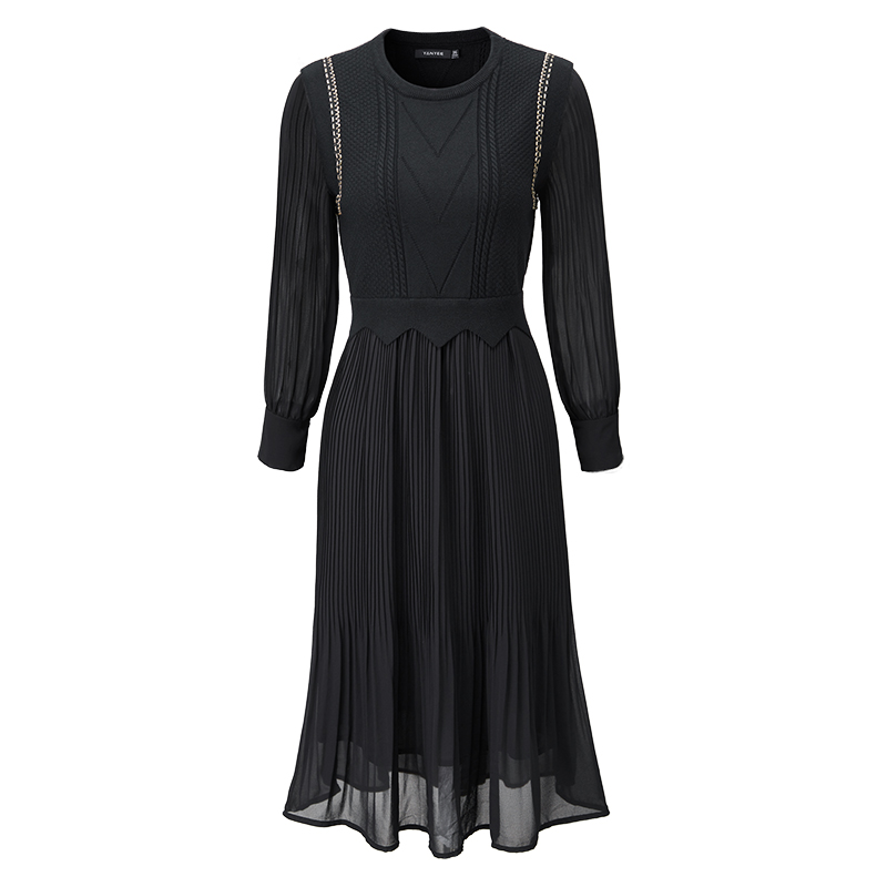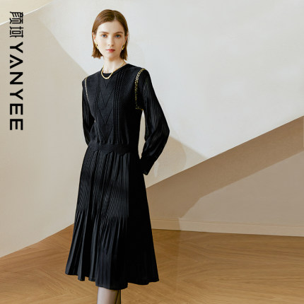 颜域黑色连衣裙秋冬季女装2025年新款显瘦连身裙针织假两件百褶裙