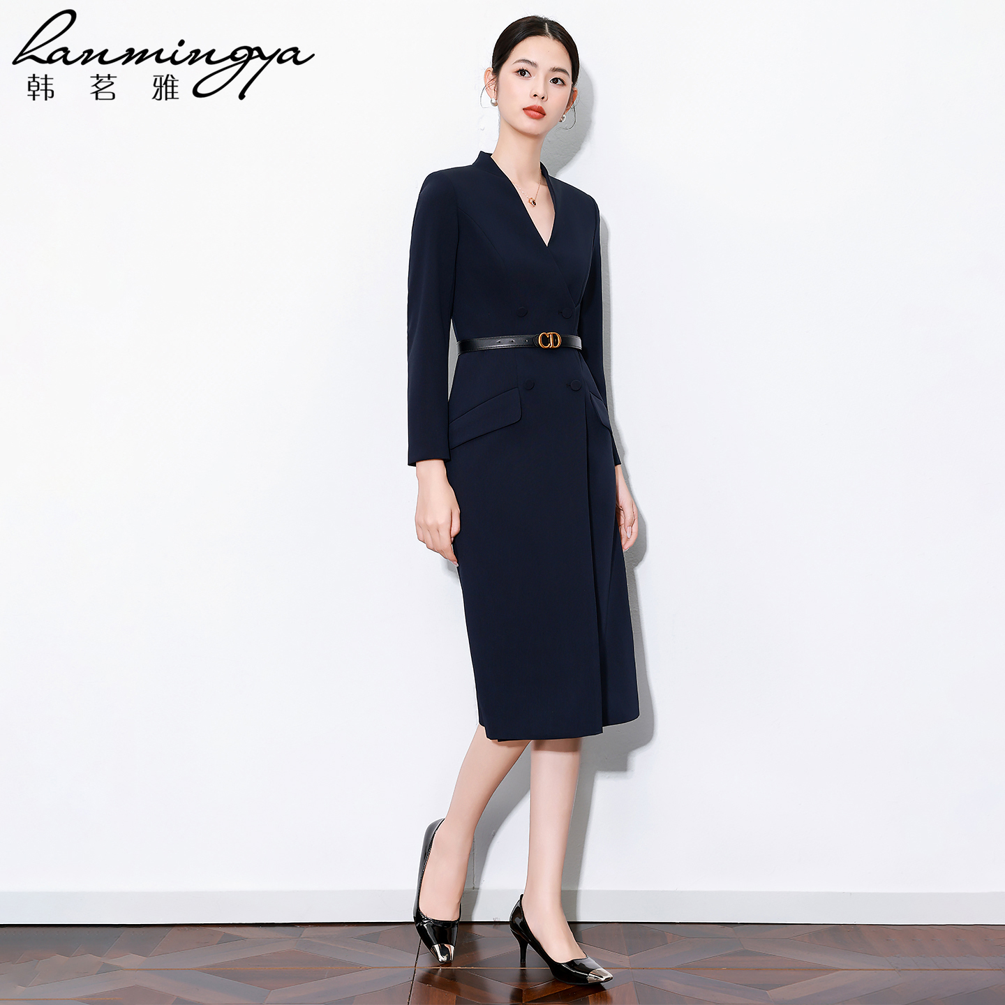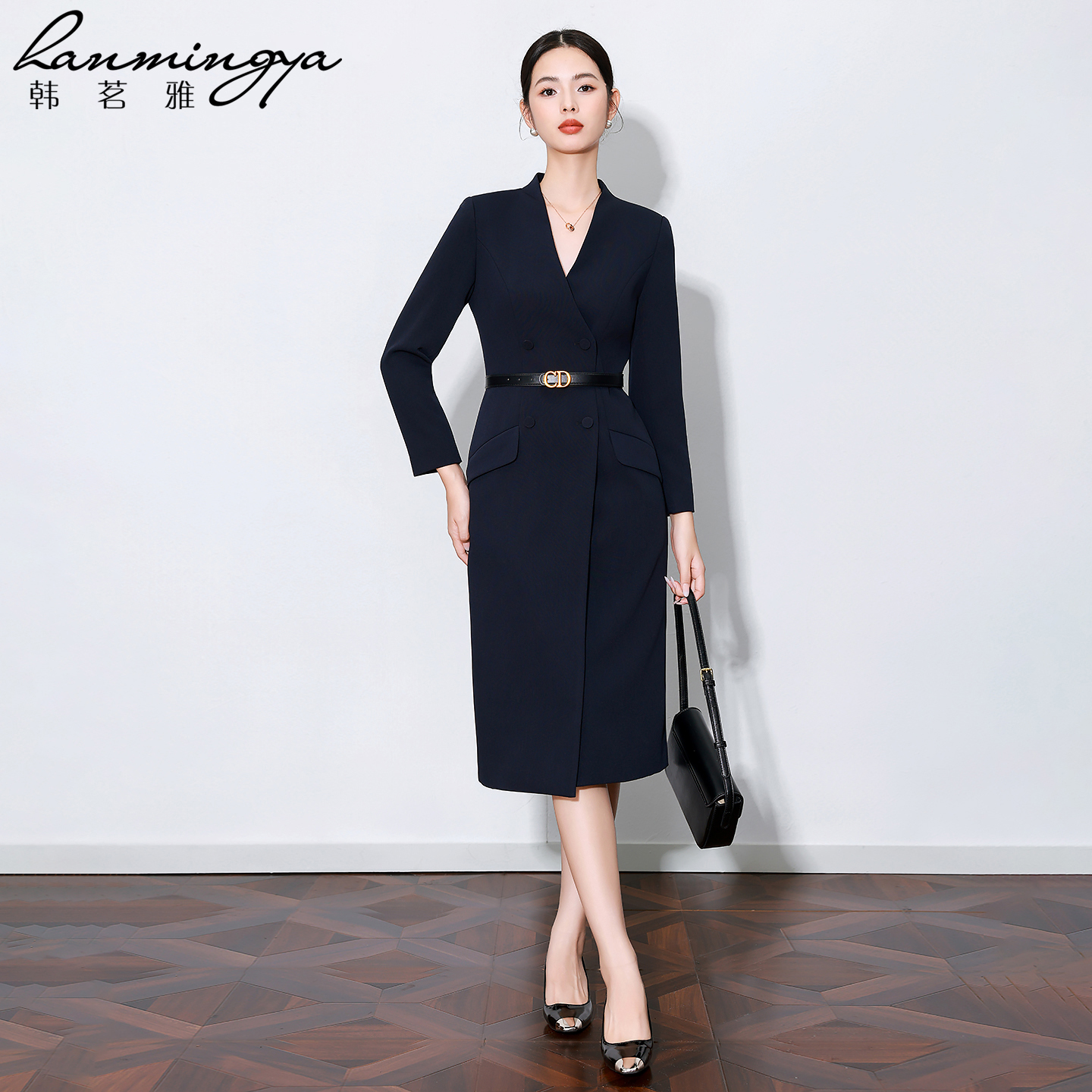 韩茗雅藏青色西装连衣裙女高级感气质修身女神范职业装裙通勤工作