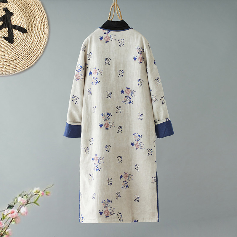 中国风亚麻棉印花旗袍裙折扣冬季斜襟加棉夹棉复古中式棉袍连衣裙