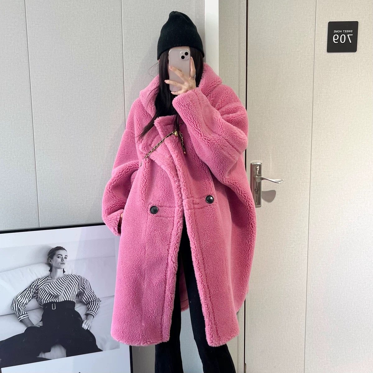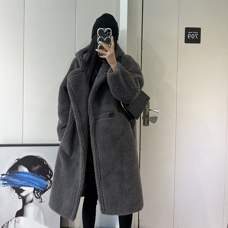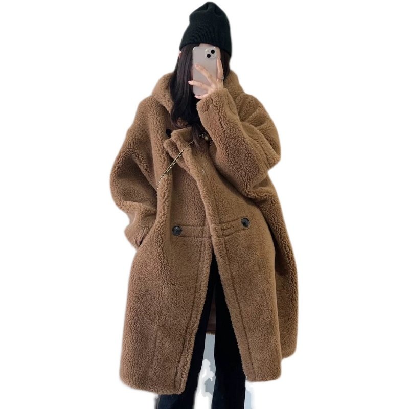 2025新款泰迪熊长款连帽外套皮毛一体羊剪绒皮草宽松毛毛大衣加厚