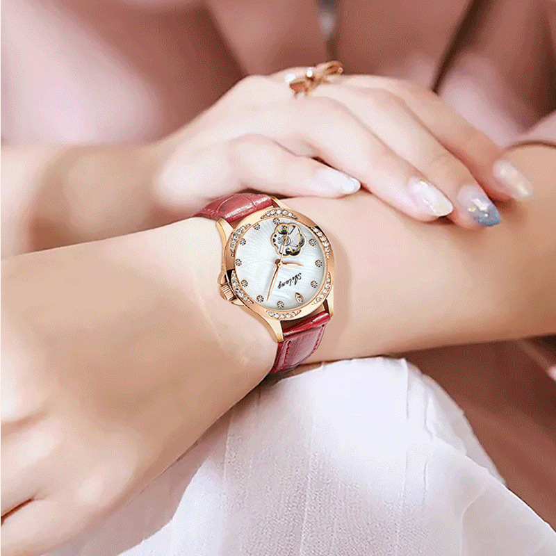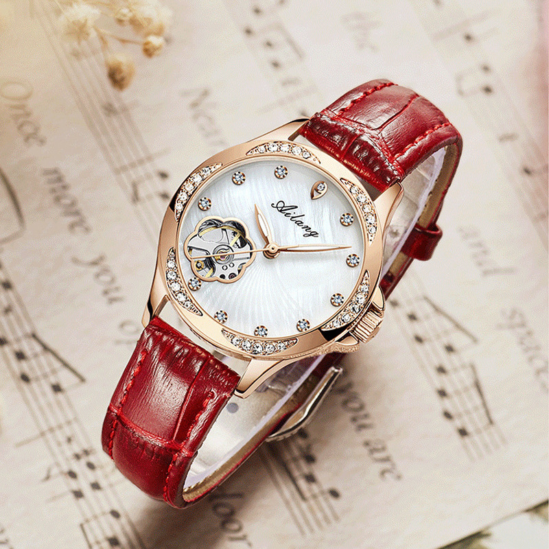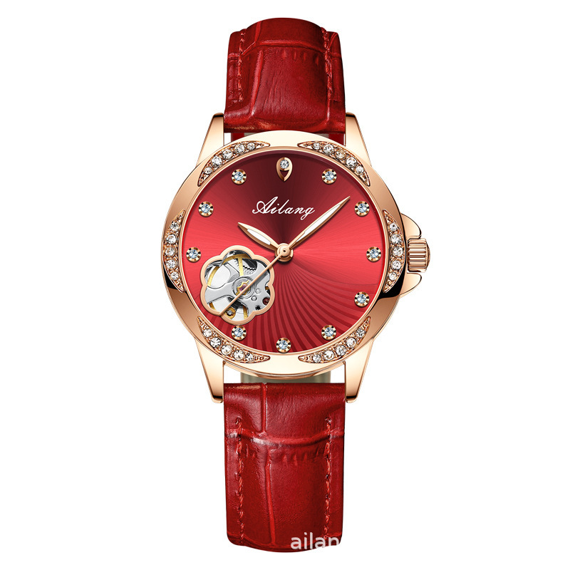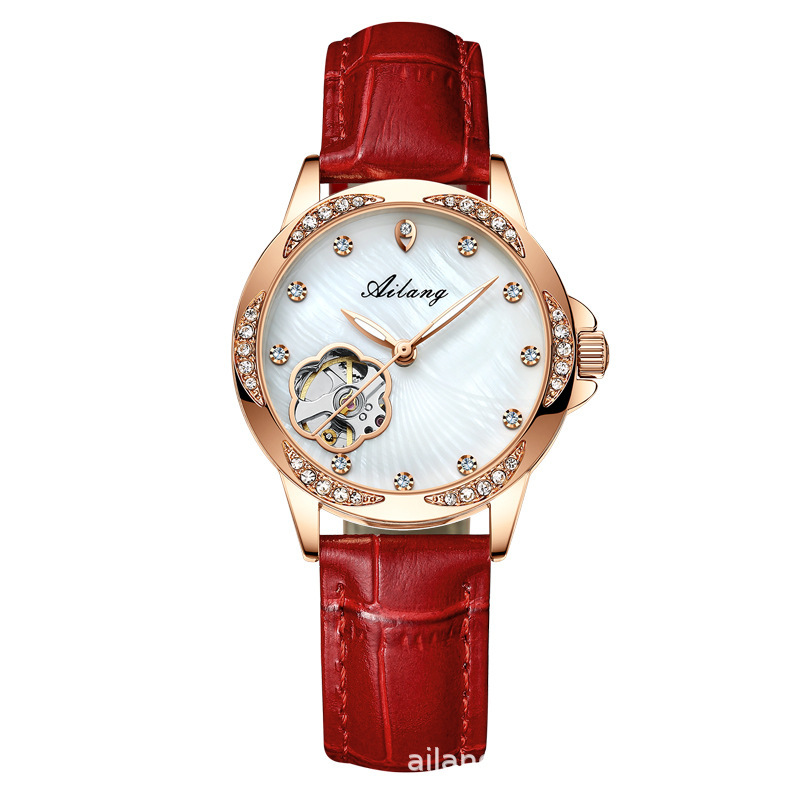 艾浪正品新款全自动机械女士手表红色真皮时尚气质镶钻女表防水表