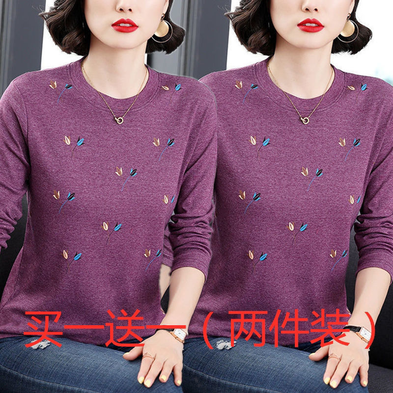 2024年长袖T恤女新款时尚妈妈春秋装宽松大码圆领显瘦上衣打底衫