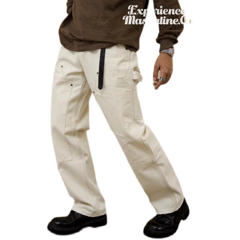 柴米白色伐木工休闲裤男破坏水洗机车牛仔裤直筒宽松美式复古咔叽