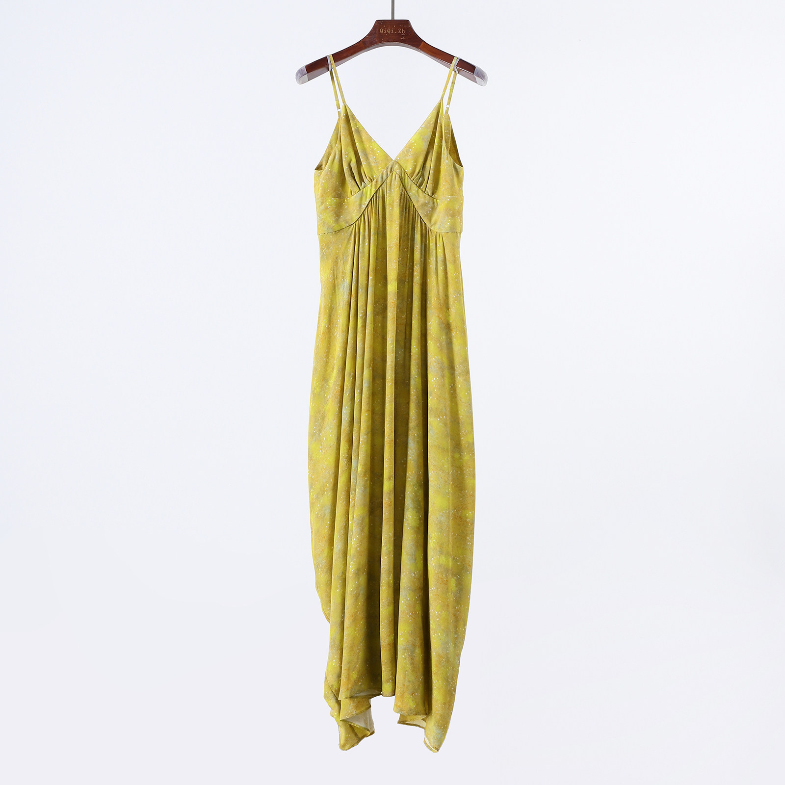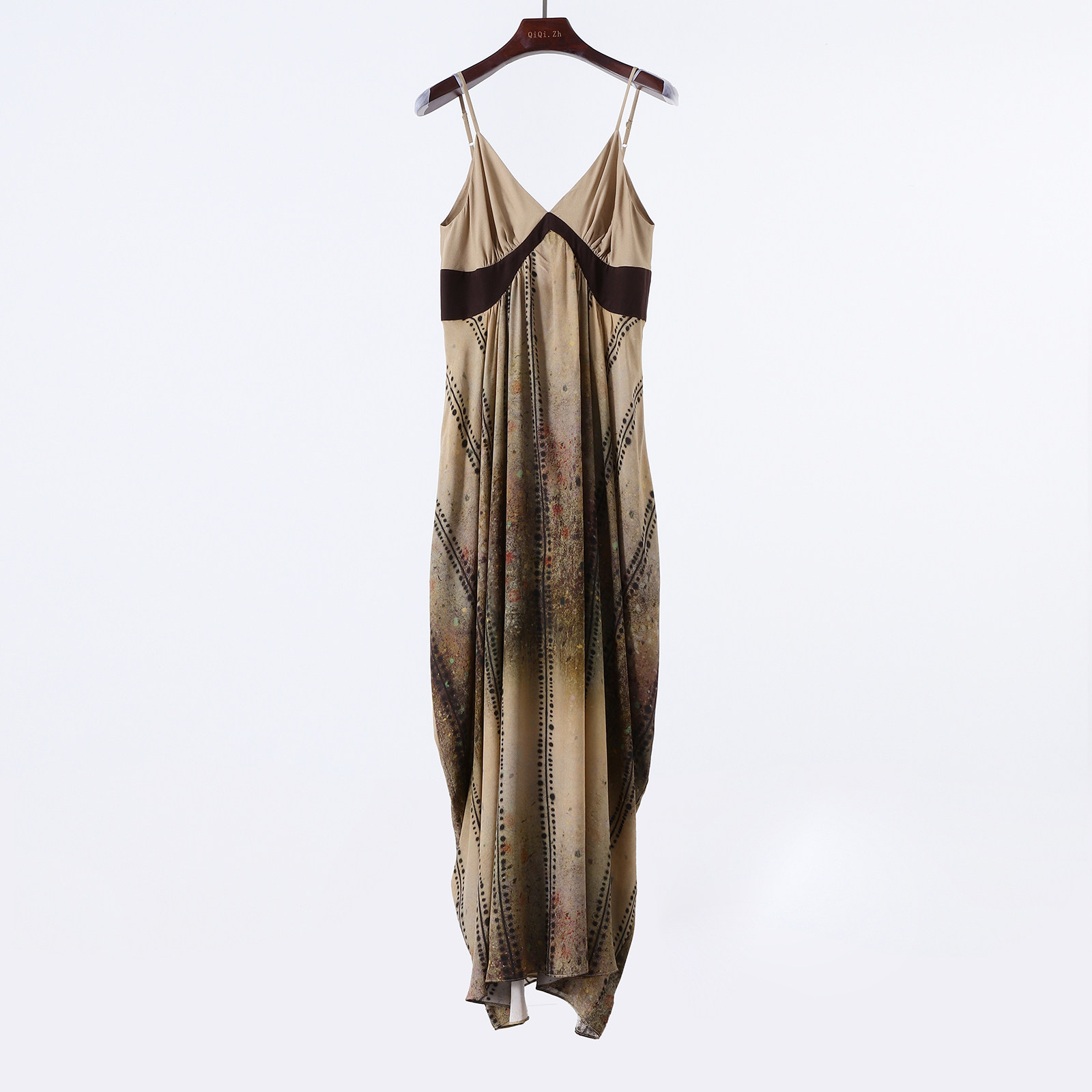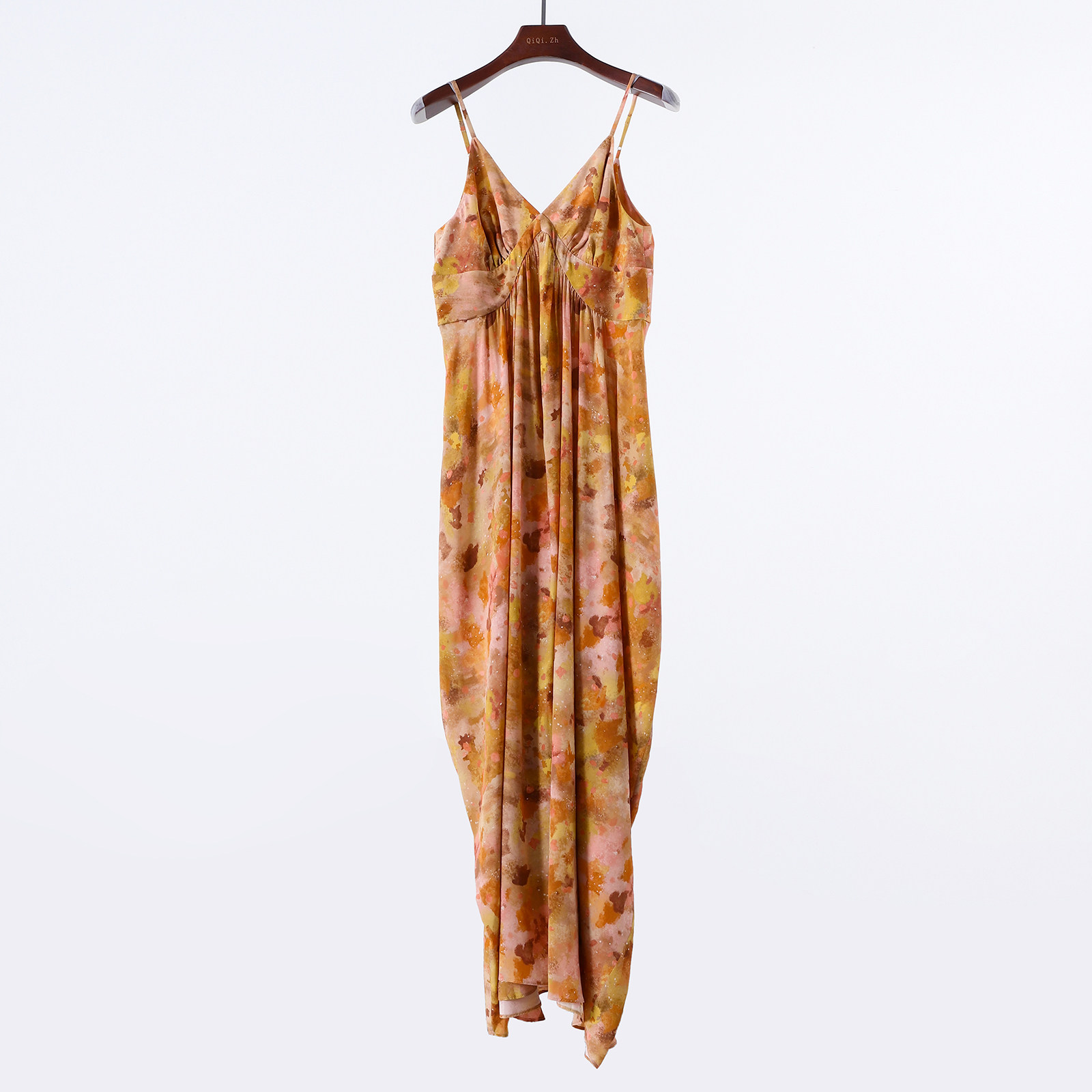 摇曳生姿 晕染油画风重磅真丝连衣裙女v领桑蚕丝吊带度假长裙