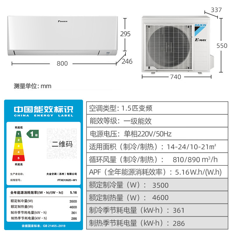Daikin/大金 FTXE135ZC-W1 新一级能效1.5匹衡境系列康达变频空调