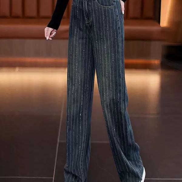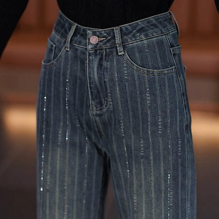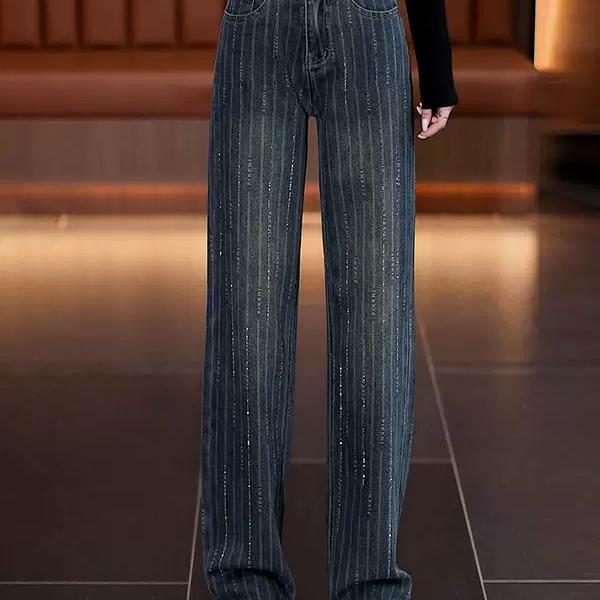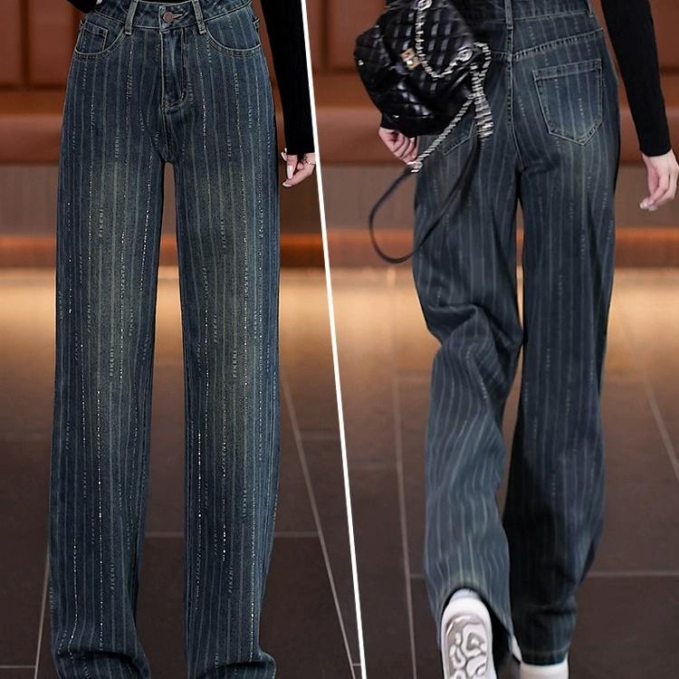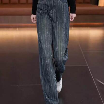 欧洲站新款轻奢欧美风竖条烫钻高腰百搭阔腿小众设计感直筒牛仔裤