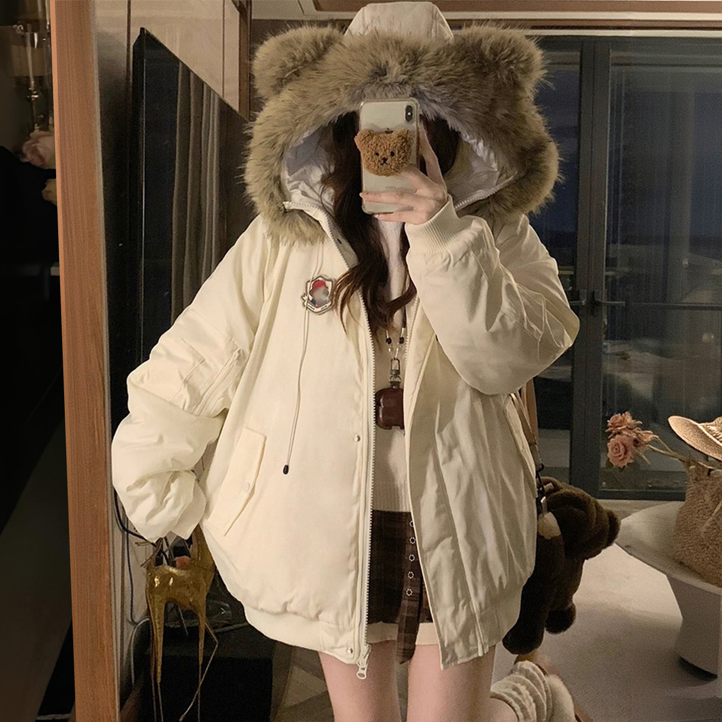 胖mm大码女装韩系防寒保暖棉服外套女秋冬新款设计感小熊连帽上衣