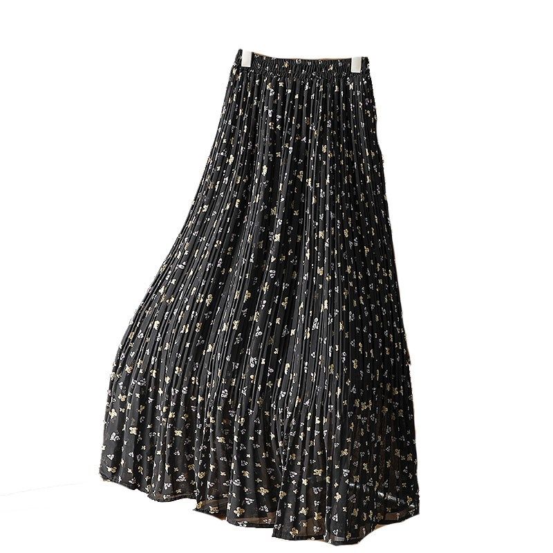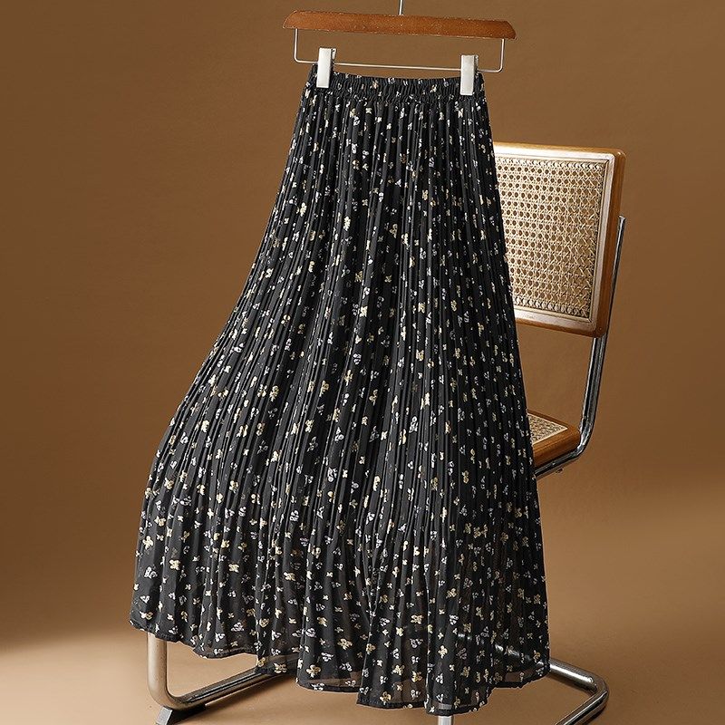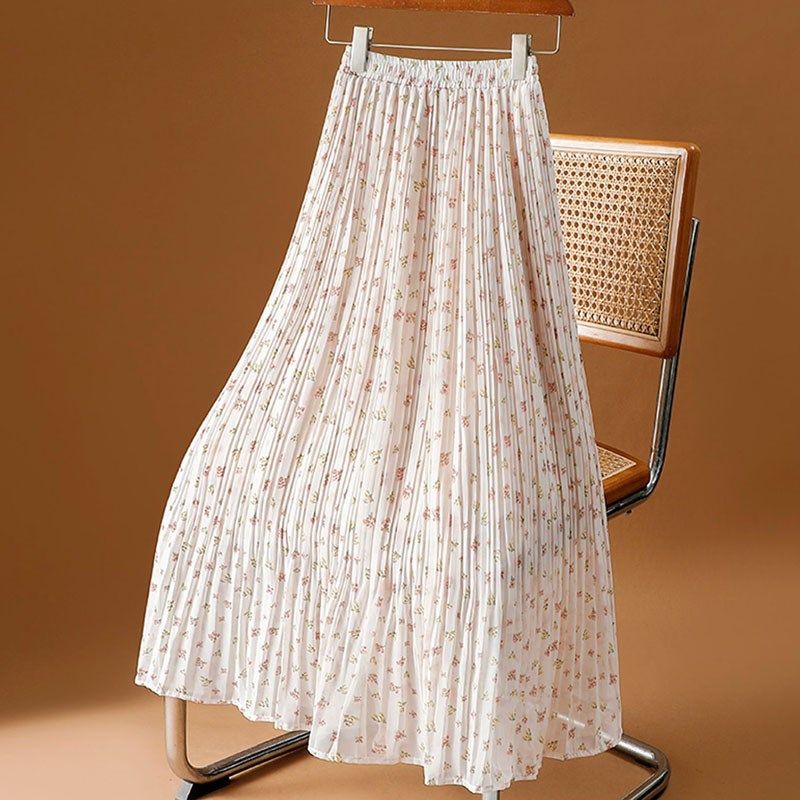 杏色碎花半身裙女夏季2024新款小个子高腰显瘦雪纺百褶裙大摆长裙