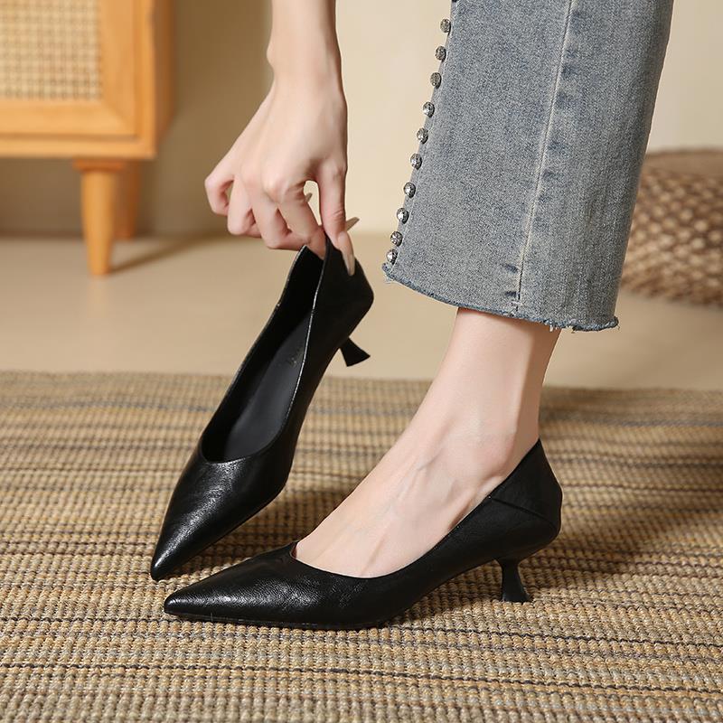 真皮两穿不磨脚职业高跟鞋女细跟上班正装工作鞋尖头中跟黑色单鞋