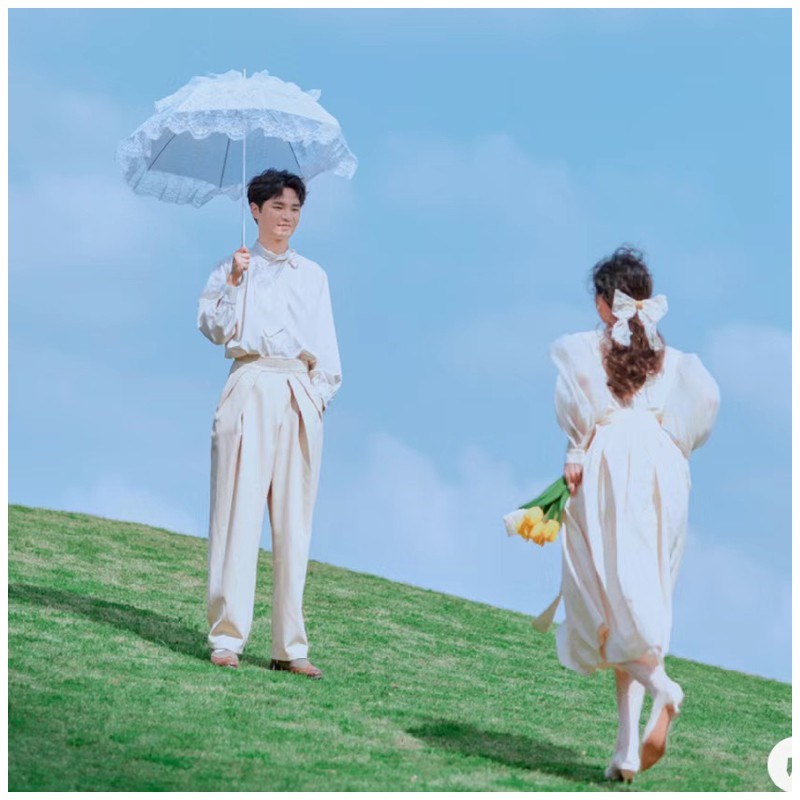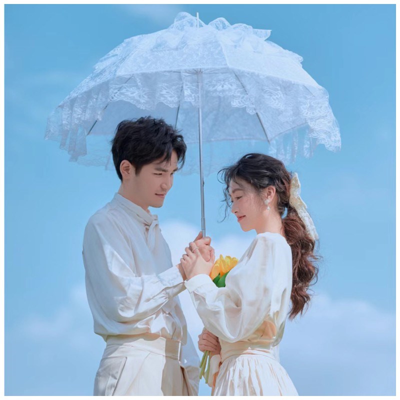 复古法式英伦风婚纱摄影外景旅拍道具蕾丝伞金色镜子黄色郁金香花