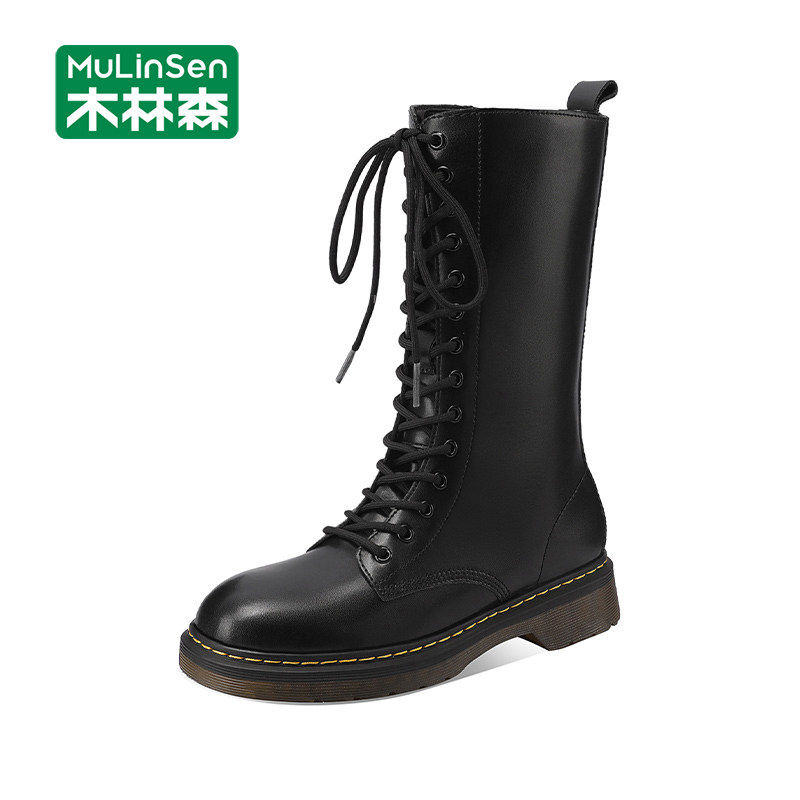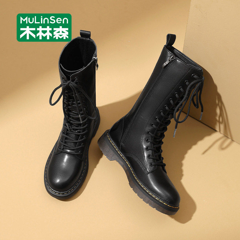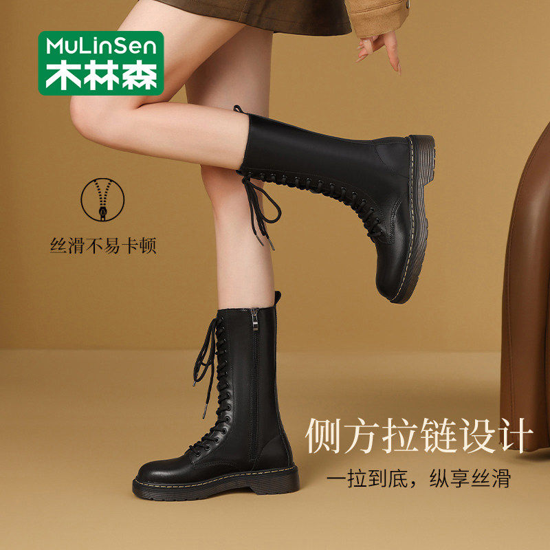 木林森马丁靴女2025新款冬季潮流休闲百搭长筒机车骑士靴厚底皮靴