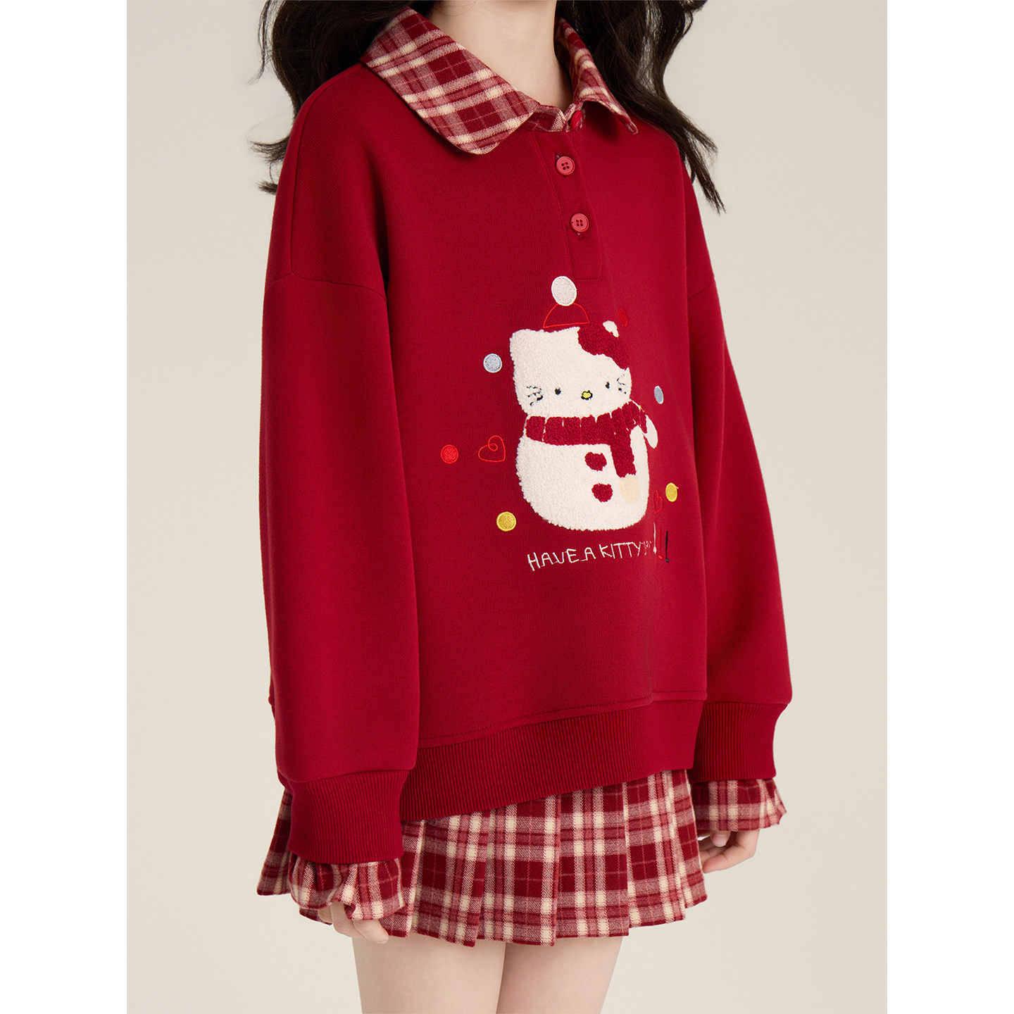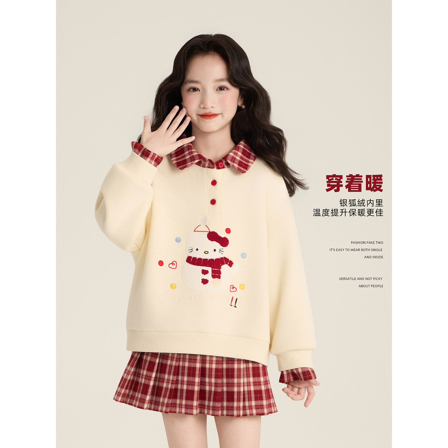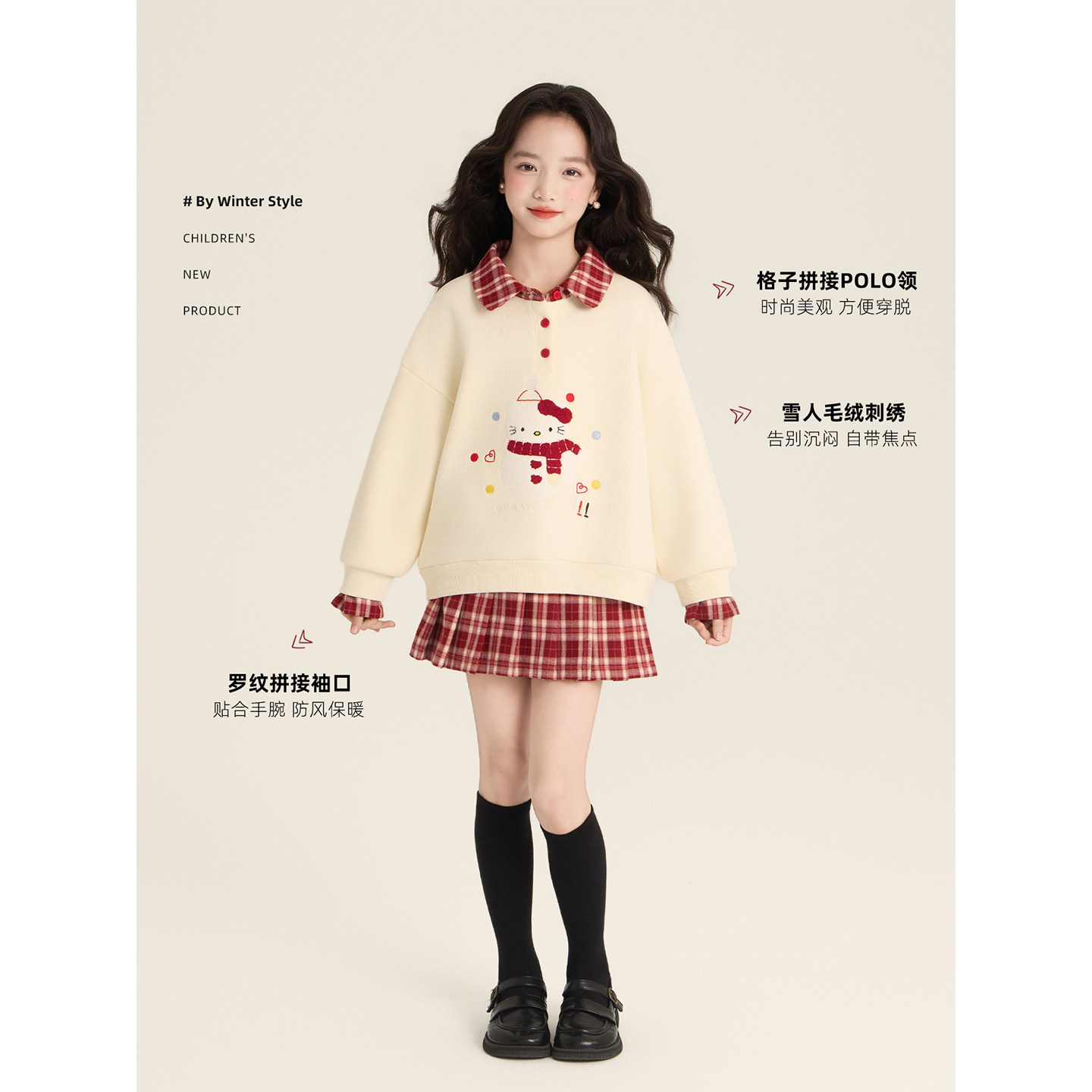 Amybaby女童套装冬季2025新款雪人刺绣POLO领加绒卫衣格子半身裙