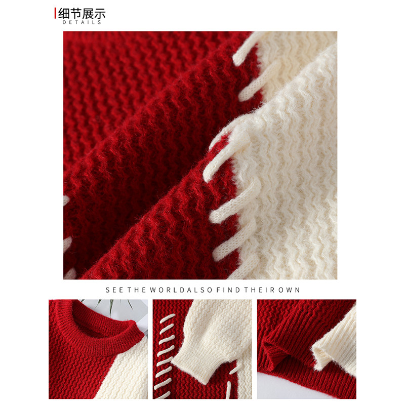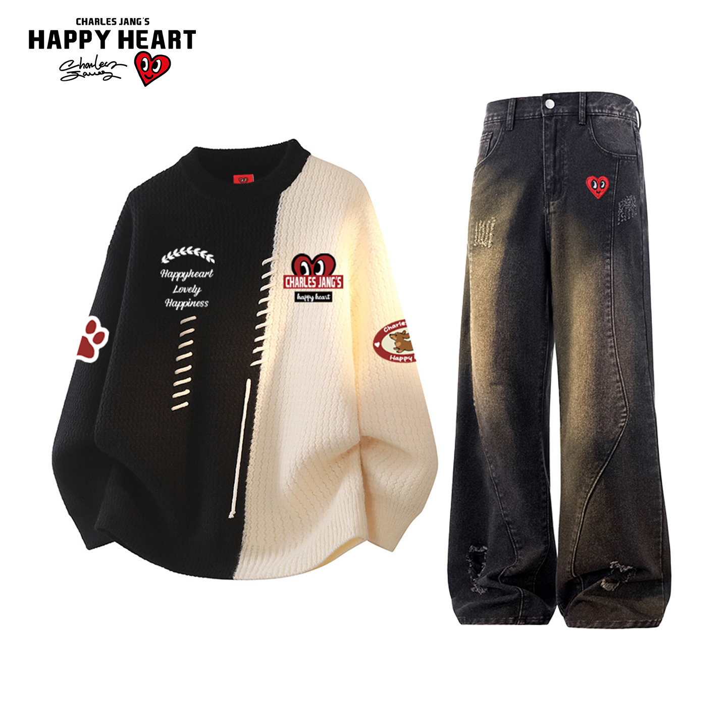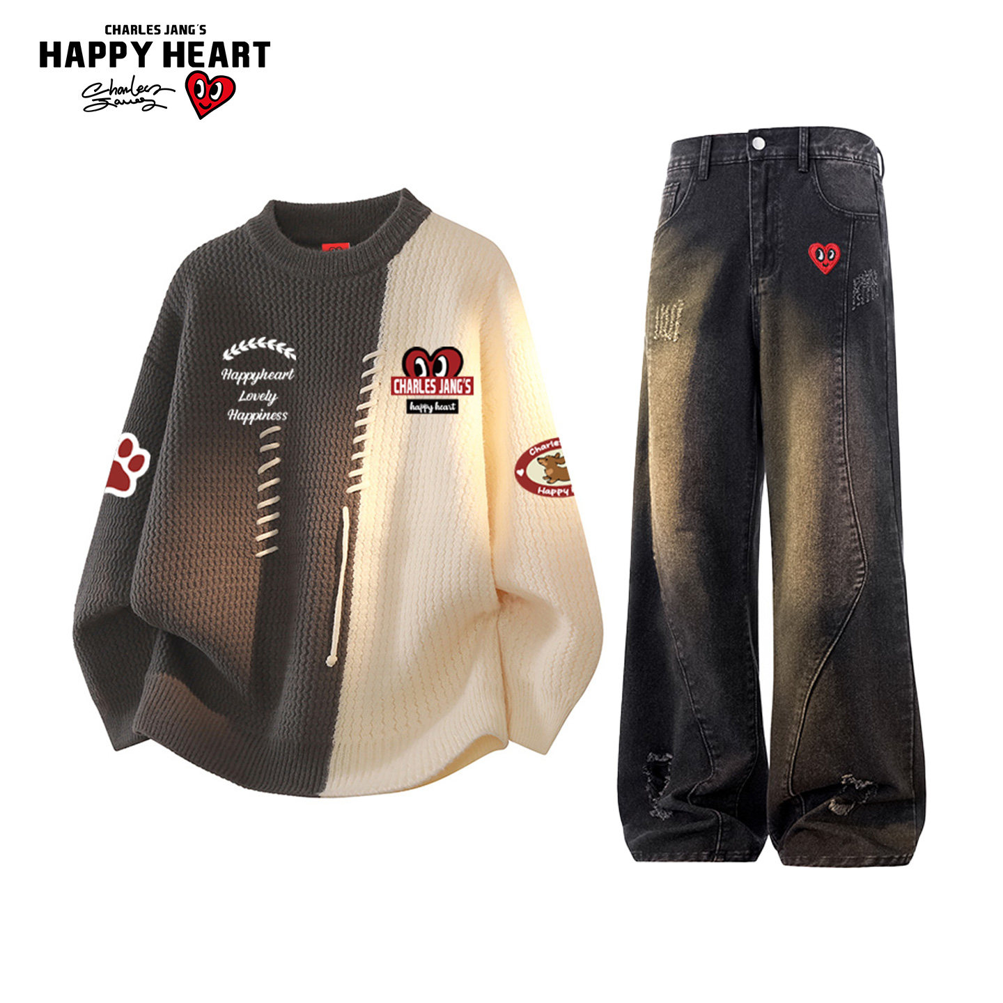 查尔斯桃心休闲套装男女冬季撞色拼接圆领毛衣牛仔长裤子两件装潮