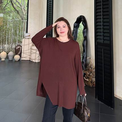 心存真大版开叉T恤女秋装新款200斤加肥加大码胖mm宽松长袖上衣