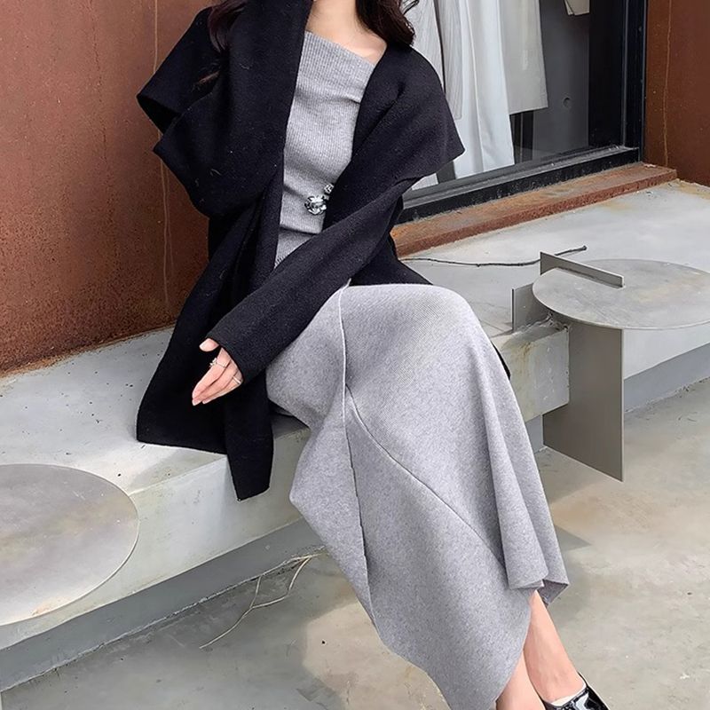 【两件套】秋冬针织毛衣一字肩不规则绑带上衣+半身长裙套装女