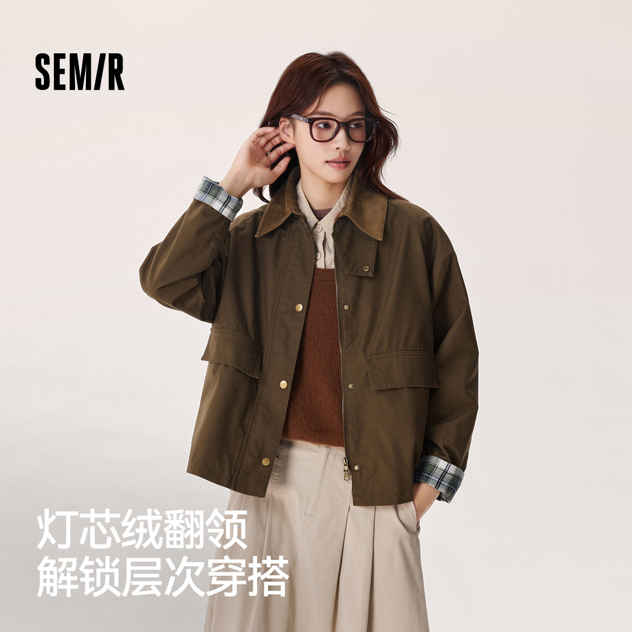 [商场同款]森马外套女巴恩风2025秋季新款宽松灯芯绒翻领拼接夹克