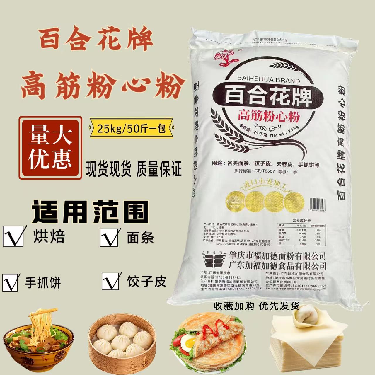 百合花牌高筋粉心粉25kg面条饺子皮云吞皮手抓饼50斤高端面粉