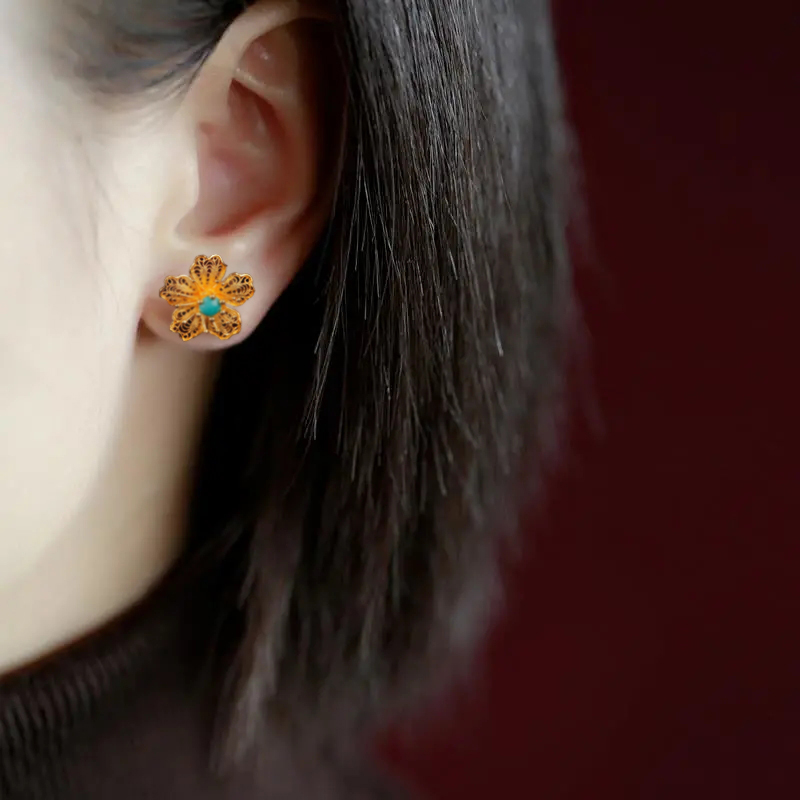 【桃蕊含春】复刻传统手工桃花金丝纯银复故宫同款绿松石宫廷耳饰