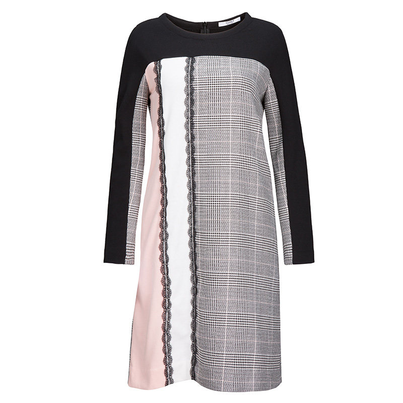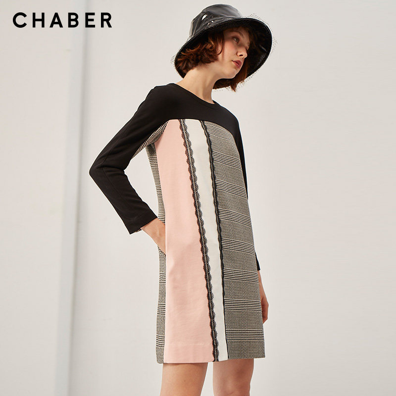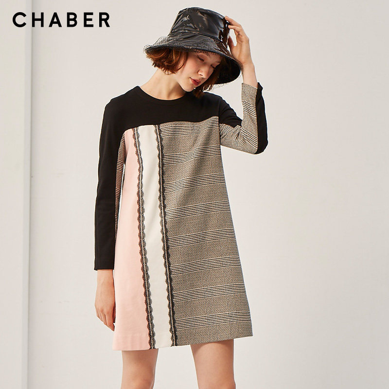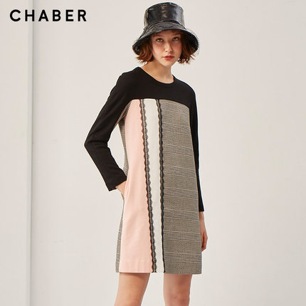 chaber巧帛法式通勤秋冬新品优雅圆领长袖正肩拼色设计连衣裙