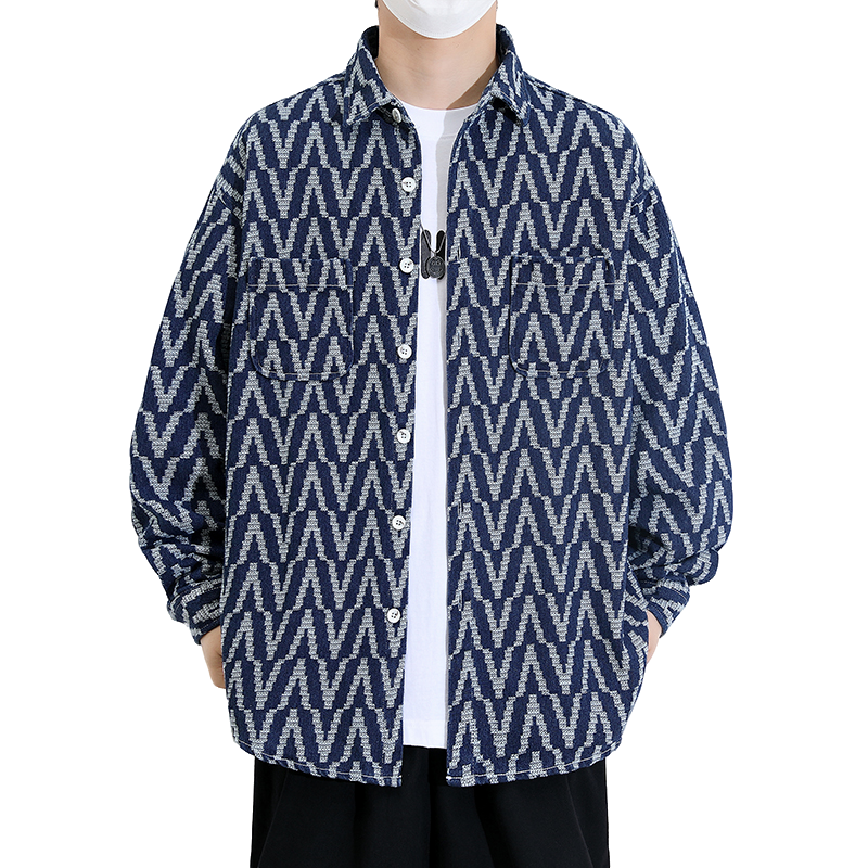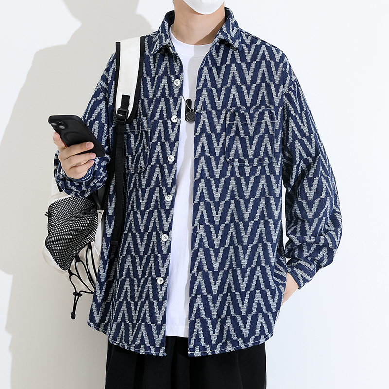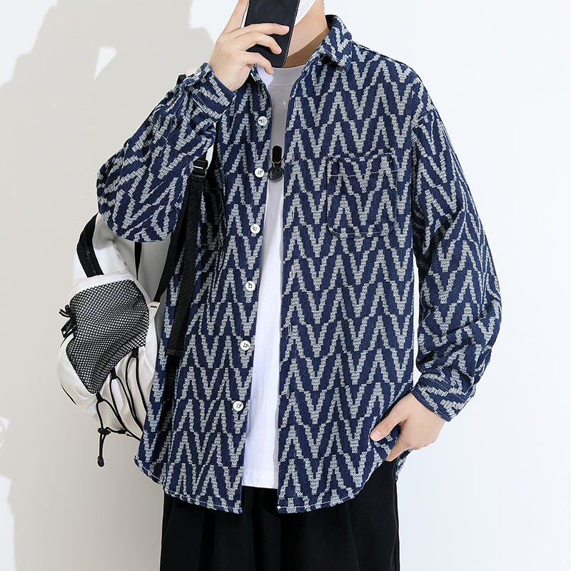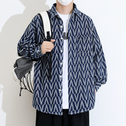 春季新款复古时尚宽松休闲条纹长袖牛仔衬衫男士潮流帅气外套上衣