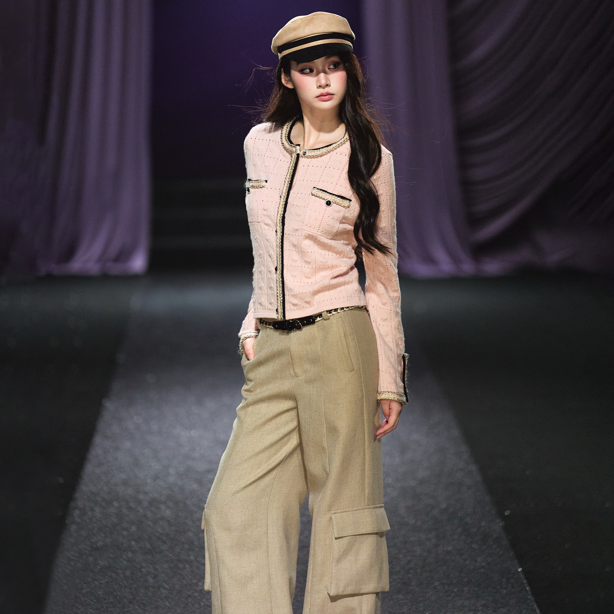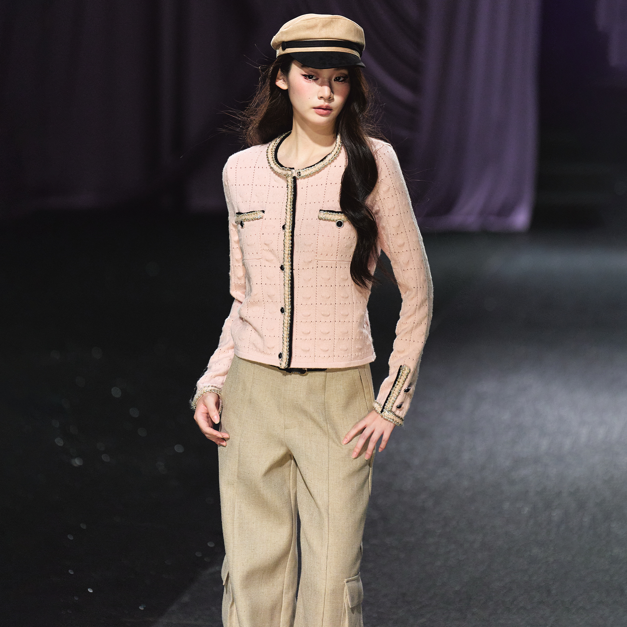 AGAM小香风粉方格镂空针织开衫外套冬季新款高级感显瘦短款上衣女
