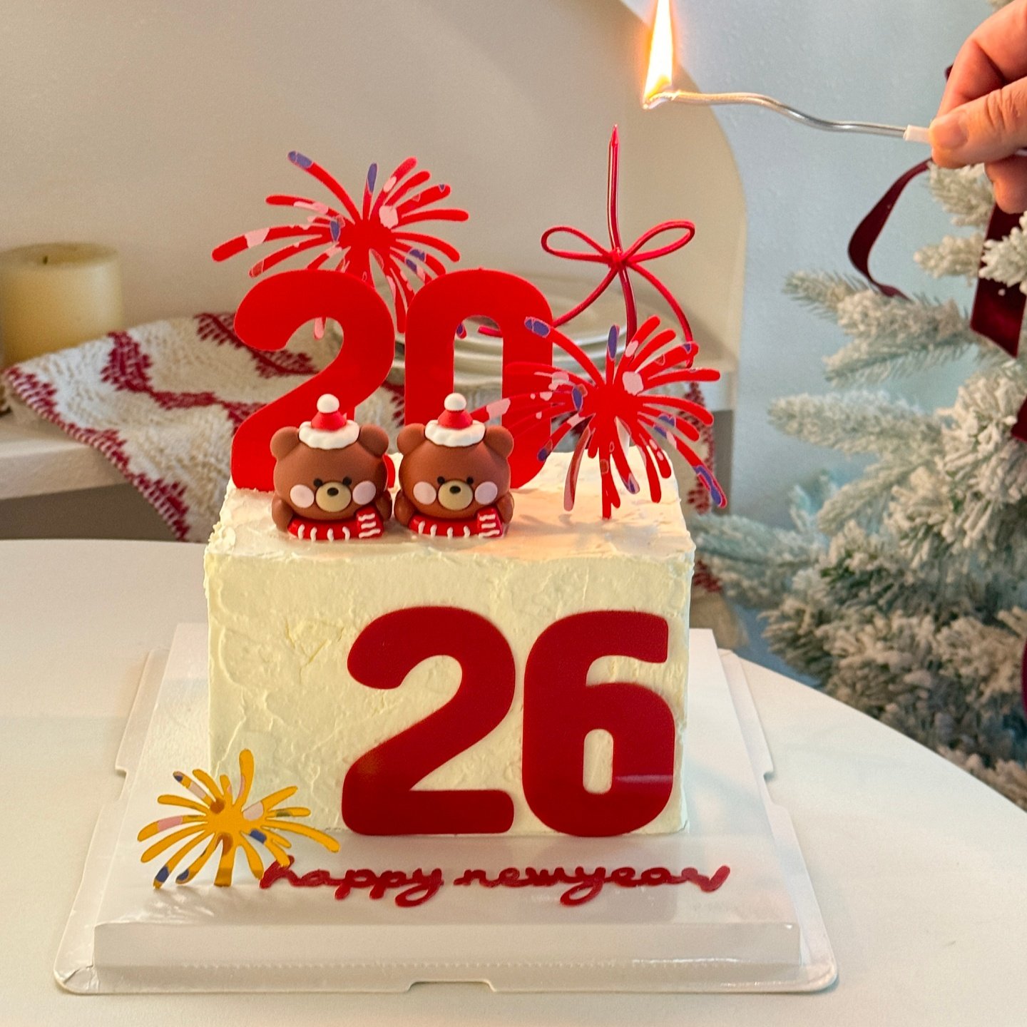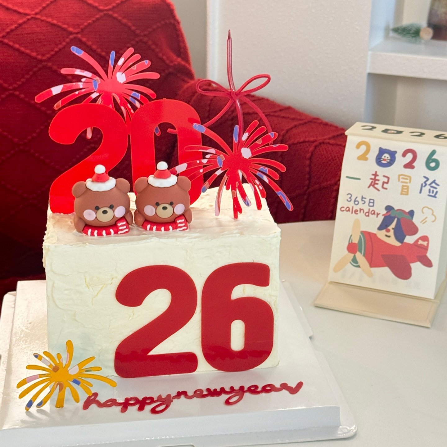 网红新年围巾小熊蛋糕装饰摆件2026礼花亚克力插牌烘焙装扮插件