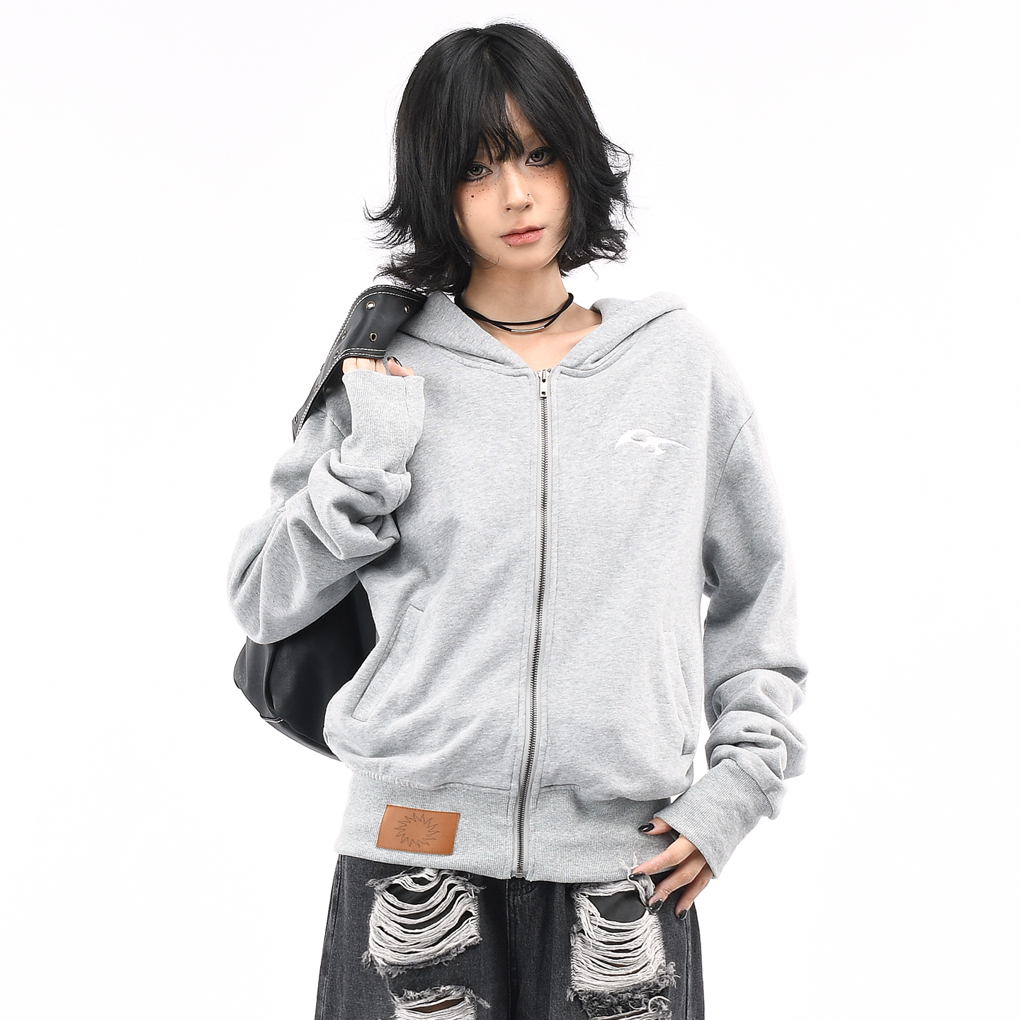 OV原创美式做旧水洗加宽螺纹短款连帽卫衣女秋季显瘦收腰开衫外套