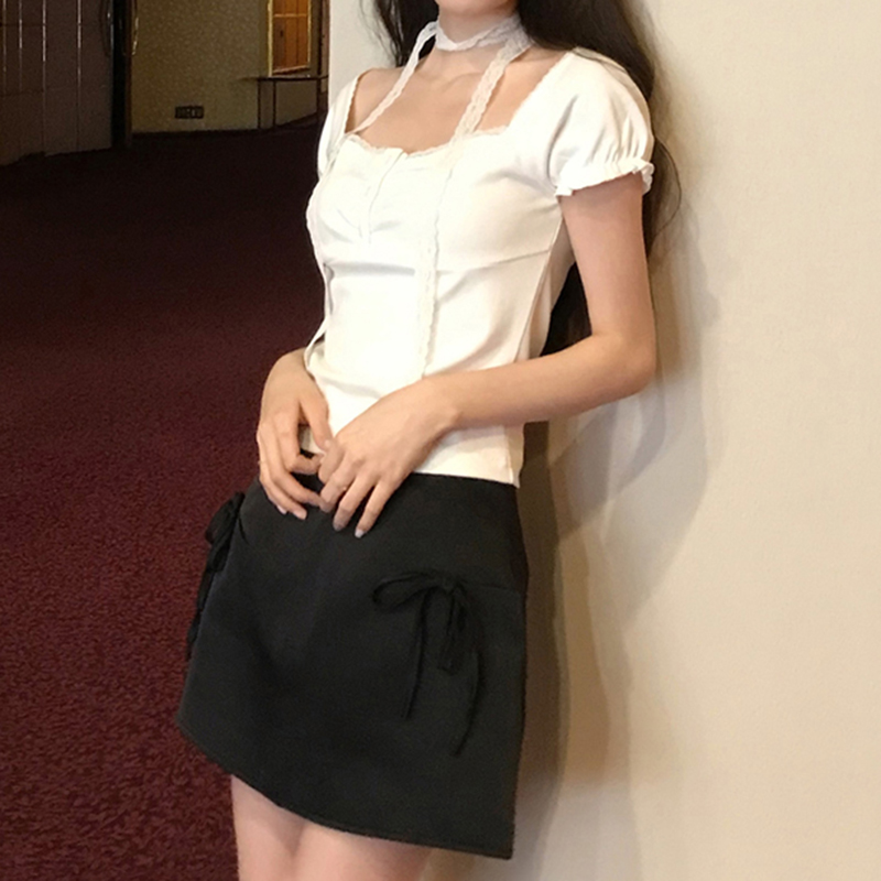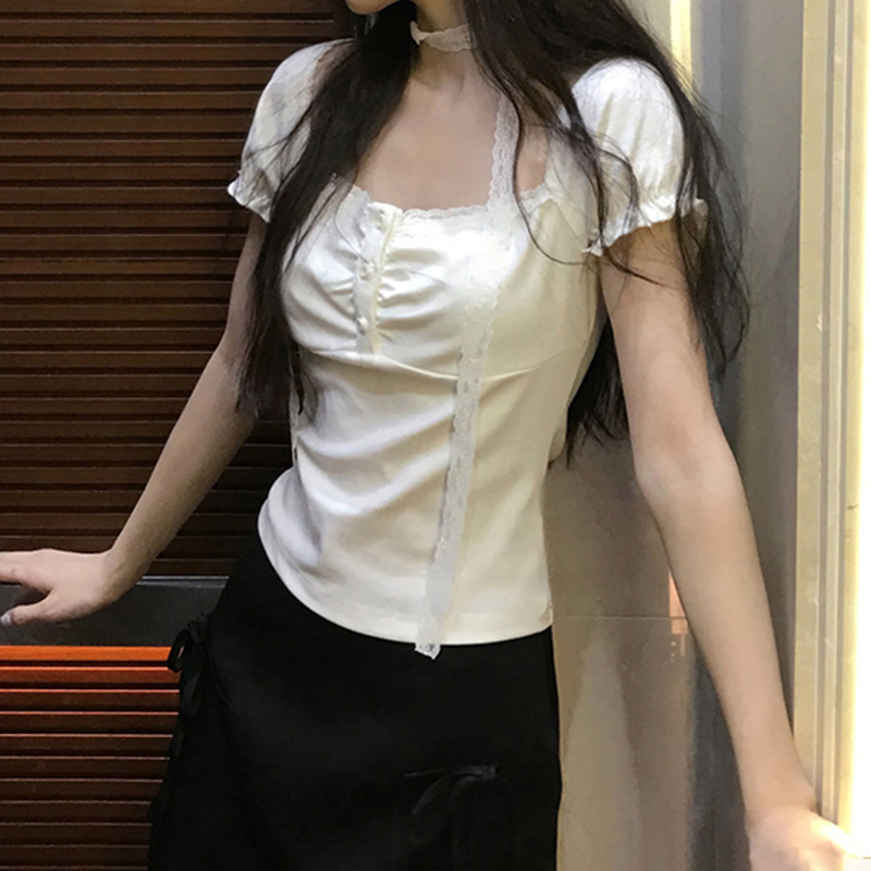 FabGirls 法式甜美蕾丝拼接褶皱排扣短袖T恤 小众百搭显瘦短上衣