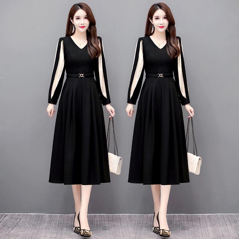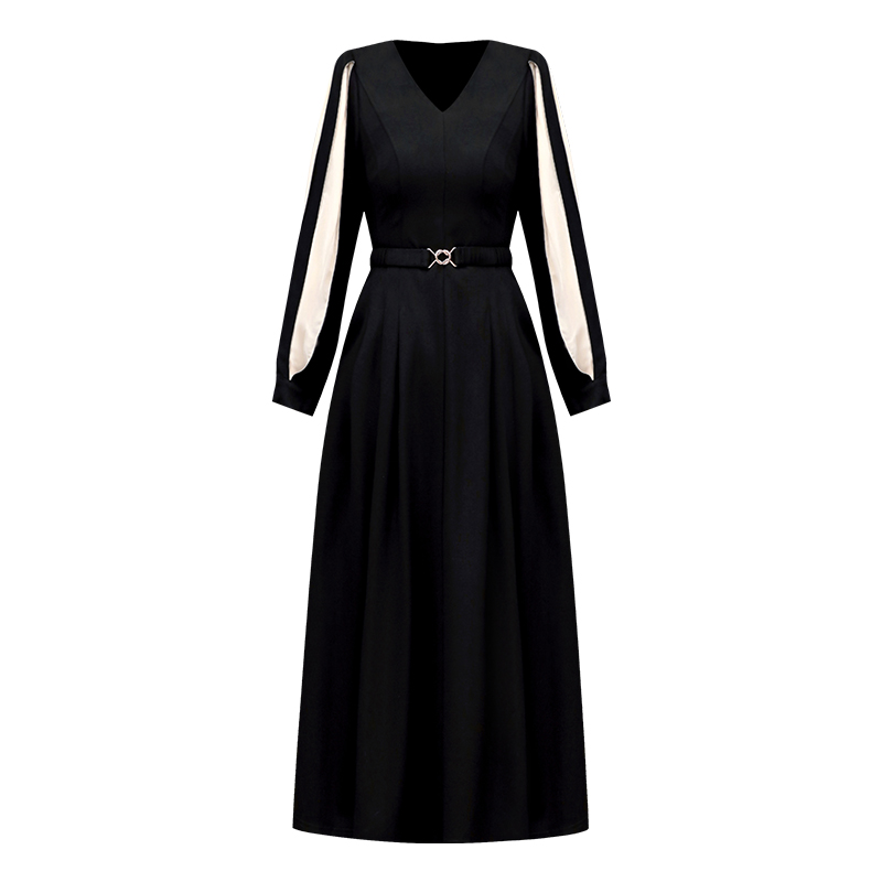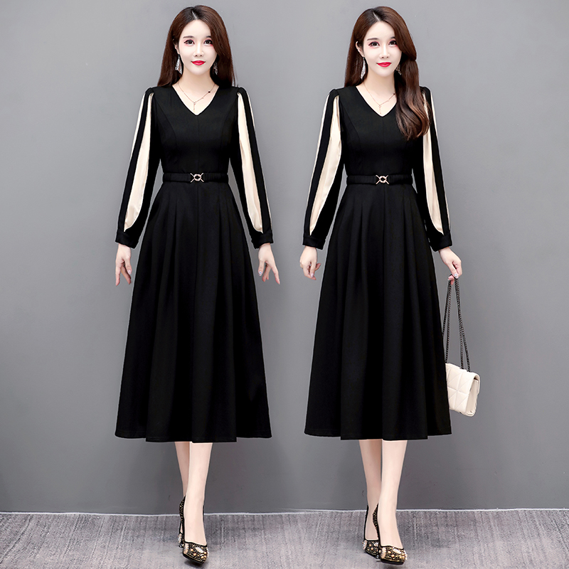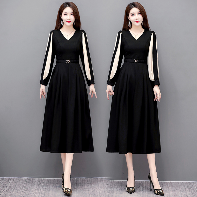 秋季高级感连衣裙女长袖灯笼袖内搭配大衣长裙赫本风黑色裙子女秋