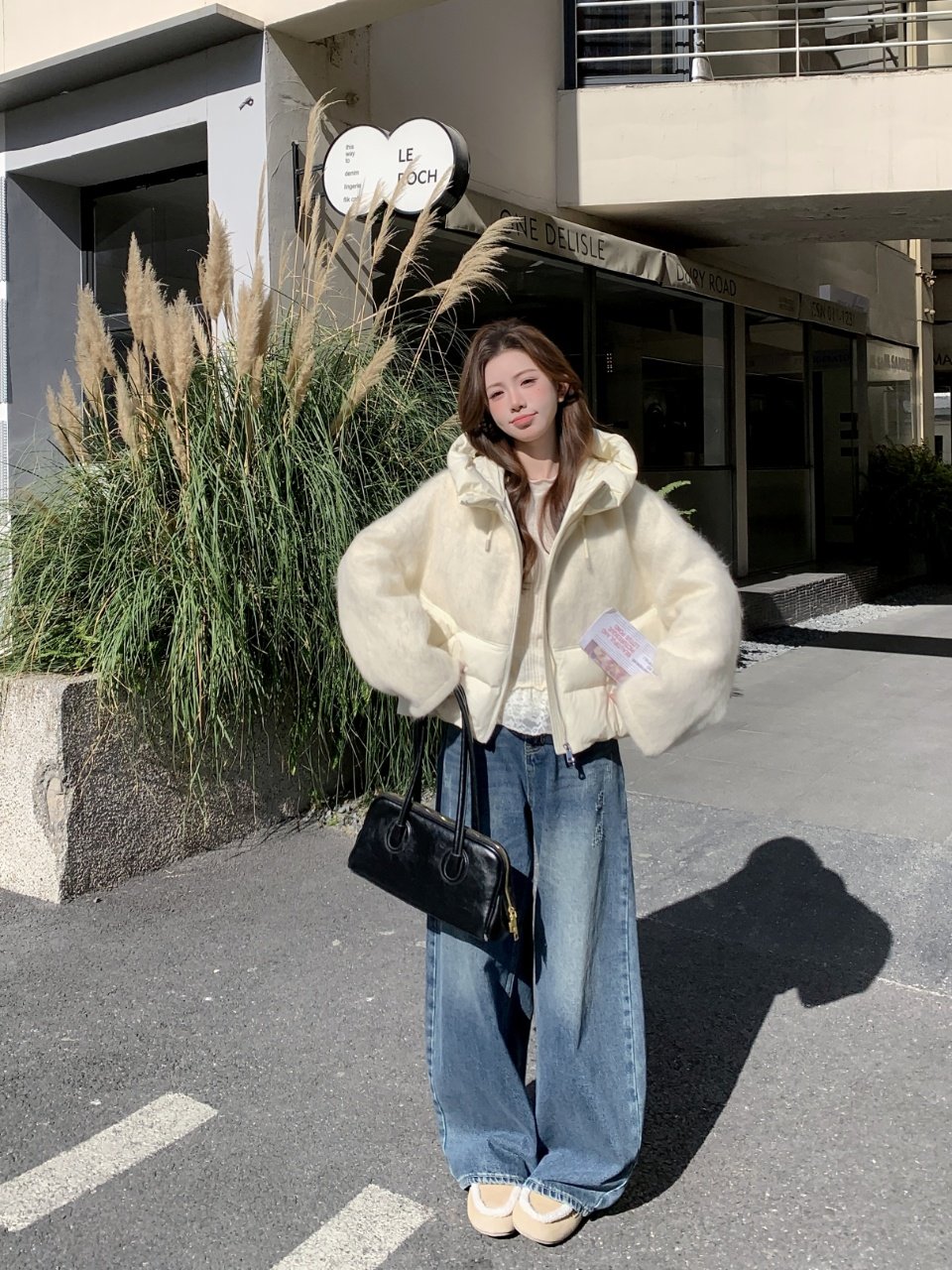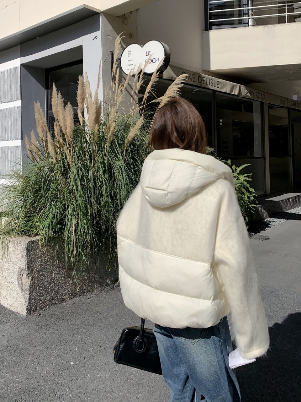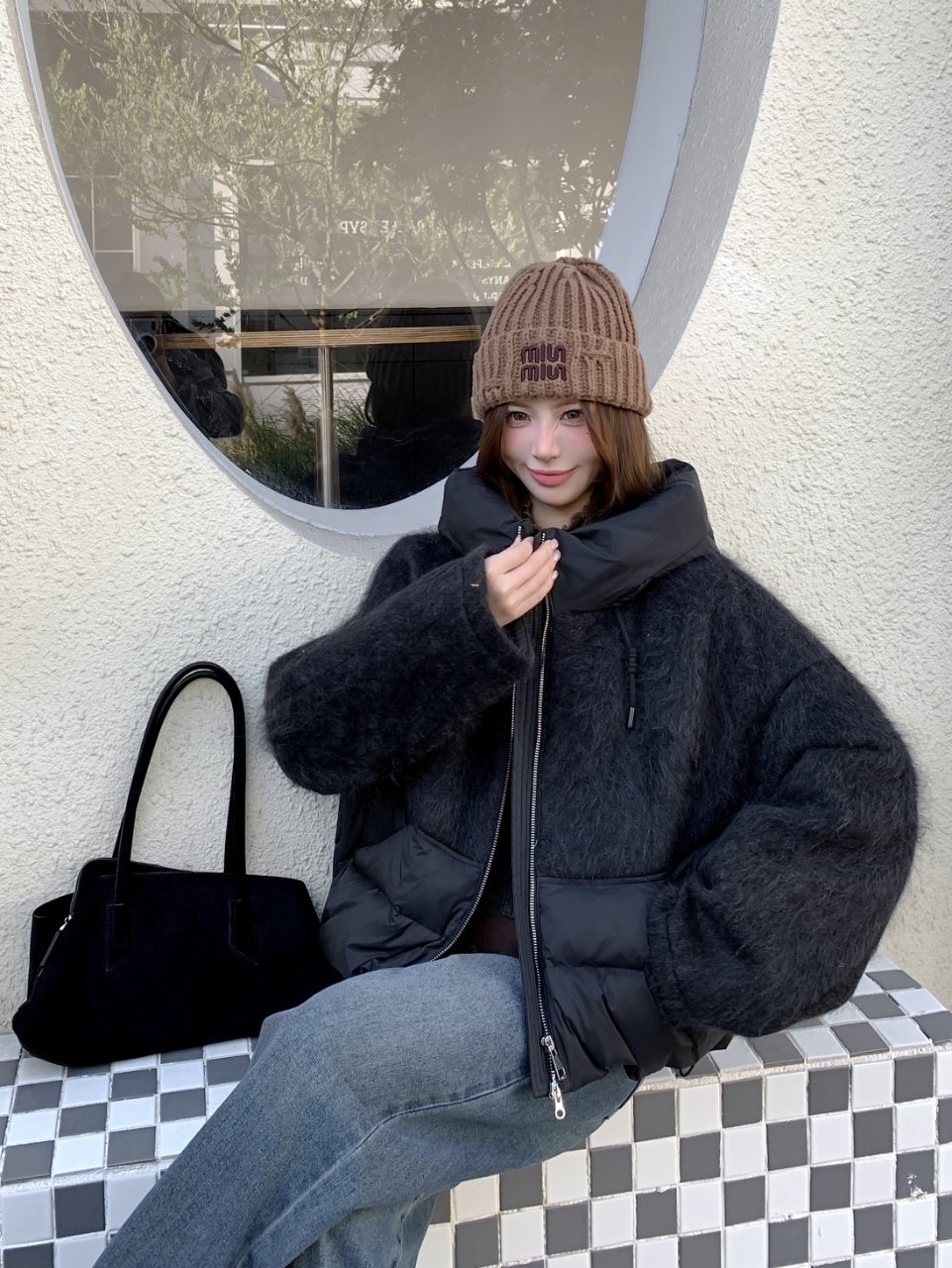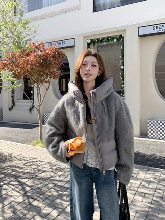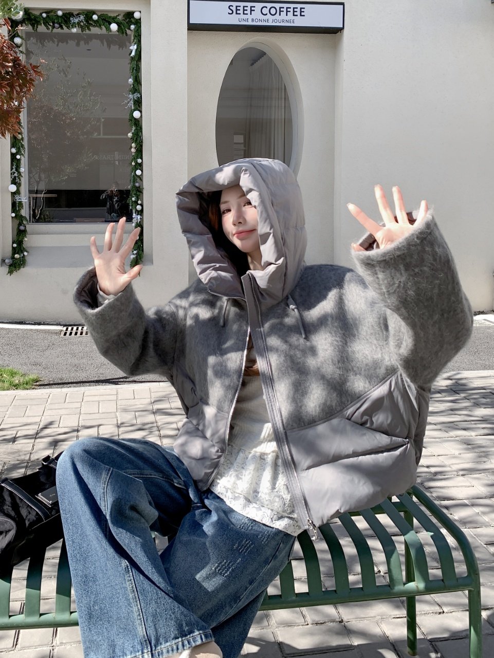 欧货2025冬新款连帽拼接羊毛短款鹅绒服女小个子加厚保暖外套潮