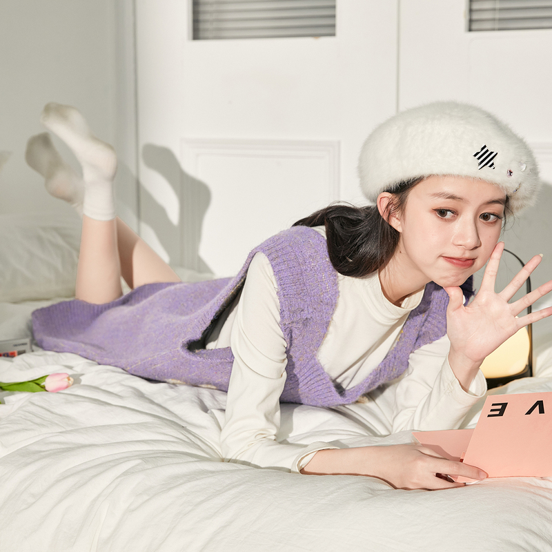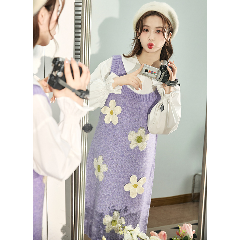 唐狮紫色背带裙冬季女装连衣裙秋冬款小个子针织毛衣马甲裙背心裙