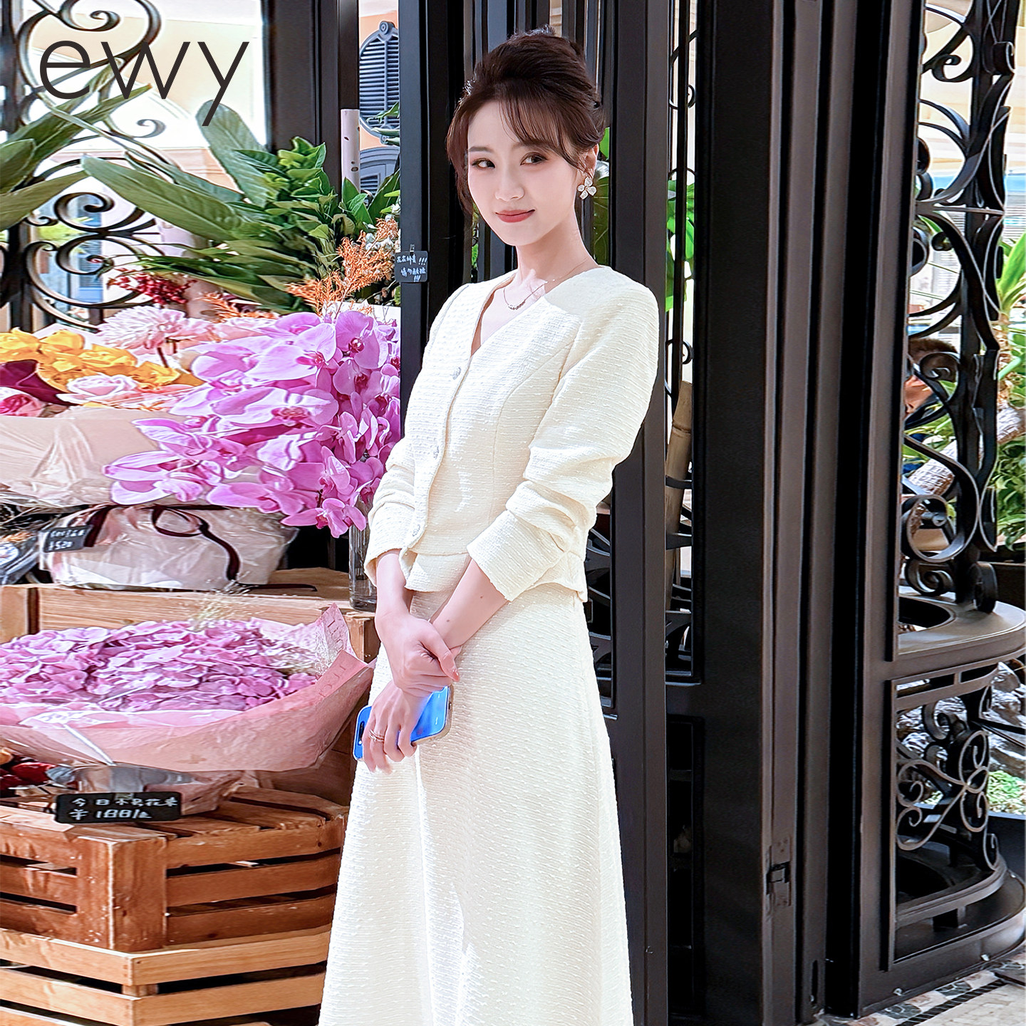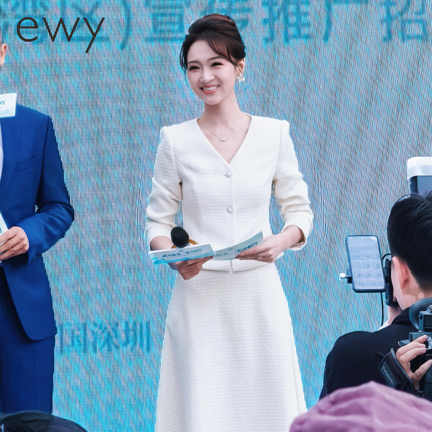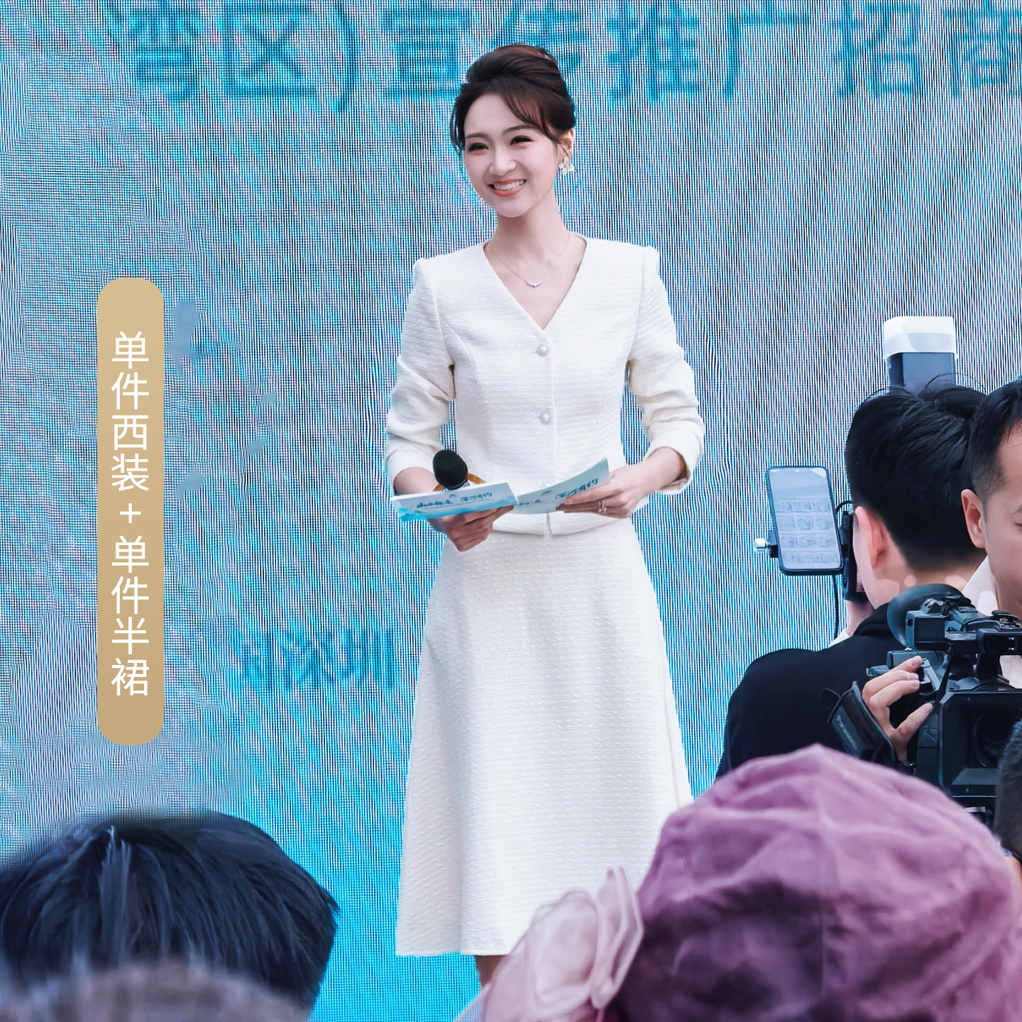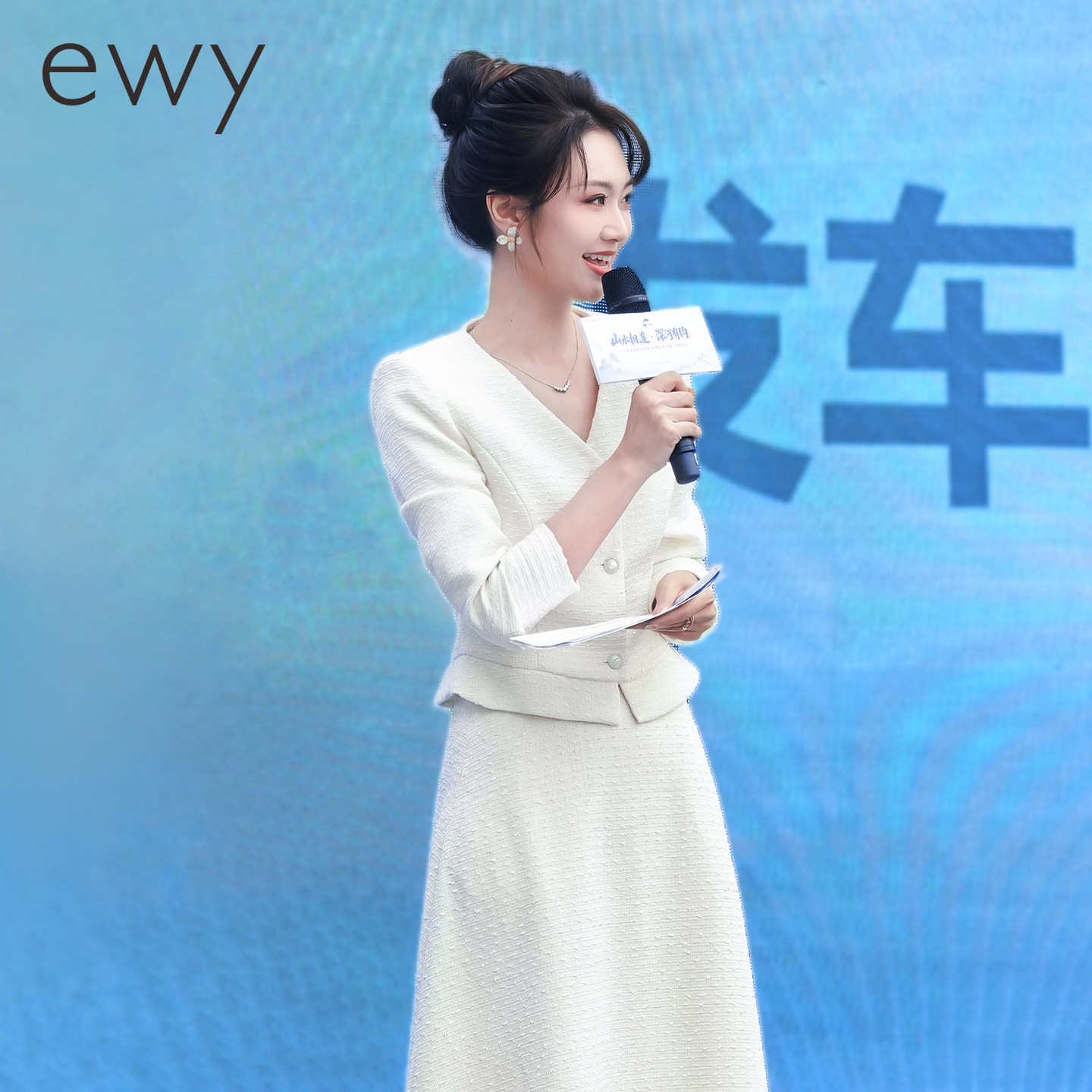 ewy小香风米色V领职业套装女长袖演讲面试主持人商务正装两件套