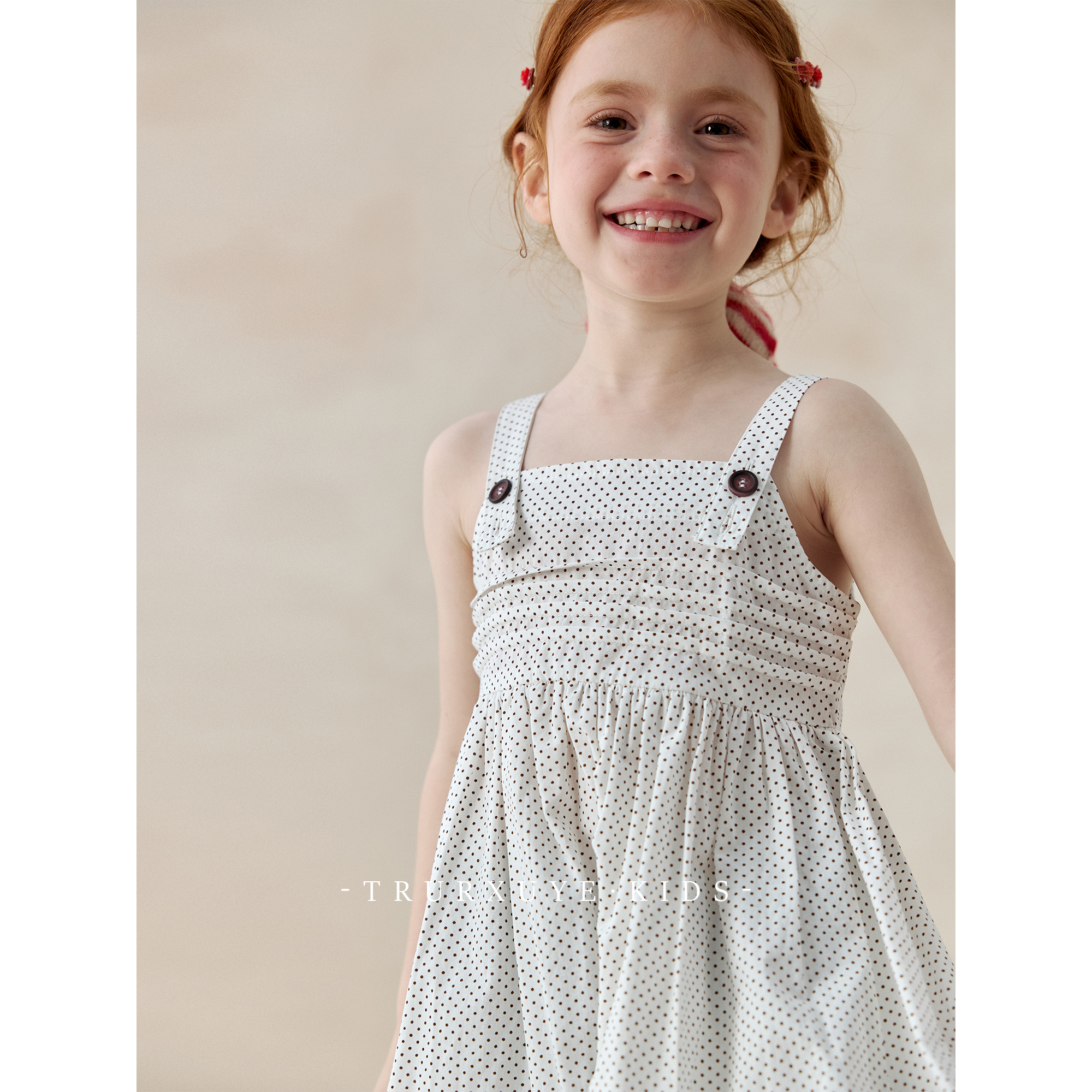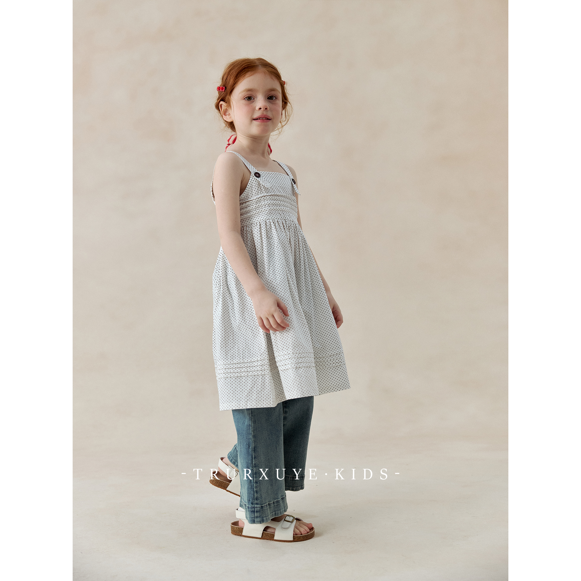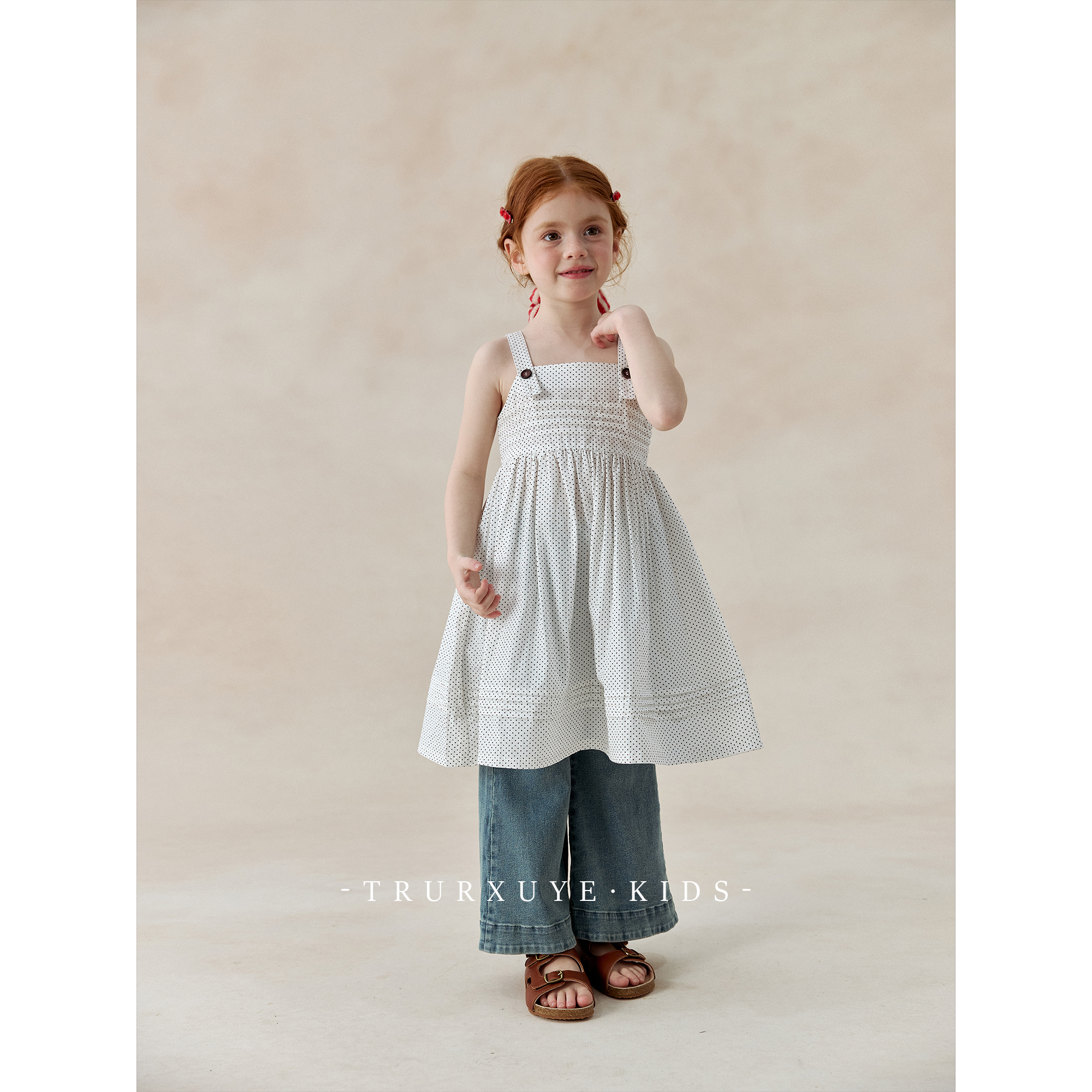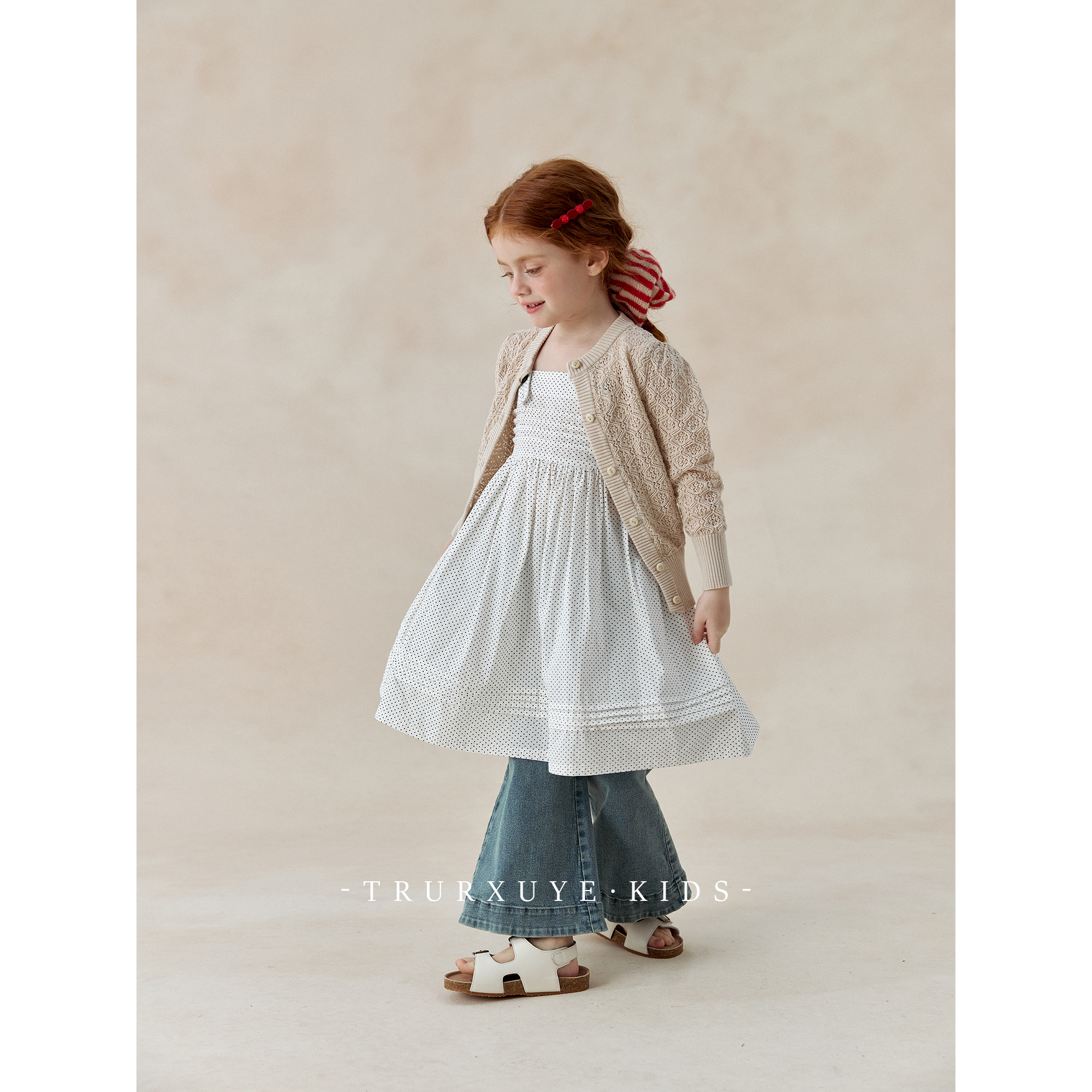 【初煦 高端女童】 时髦精!复古牛仔喇叭裤+波点吊带连衣裙套装