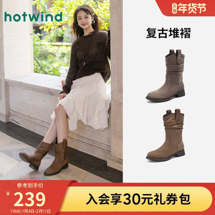 热风棕色西部牛仔靴2025年冬季新款短靴堆堆靴美拉德靴子中筒靴女