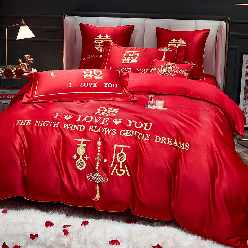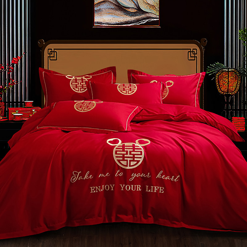 婚庆四件套大红简约刺绣结婚房z嫁礼喜庆被套床单笠欧式床上用品4