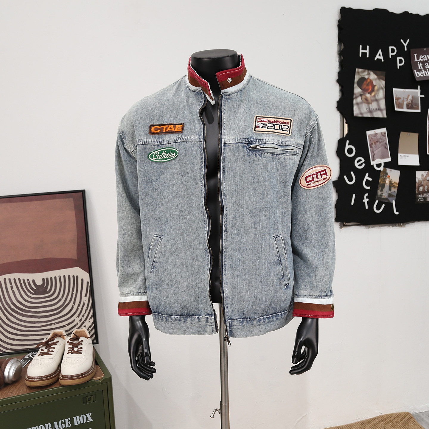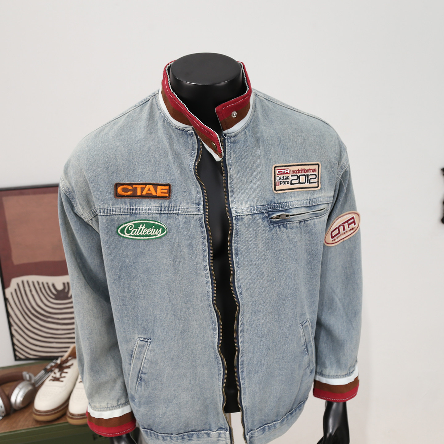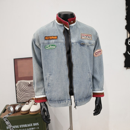 美式高街立领刺绣贴布牛仔外套男士痞帅街头洗水做旧休闲宽松夹克
