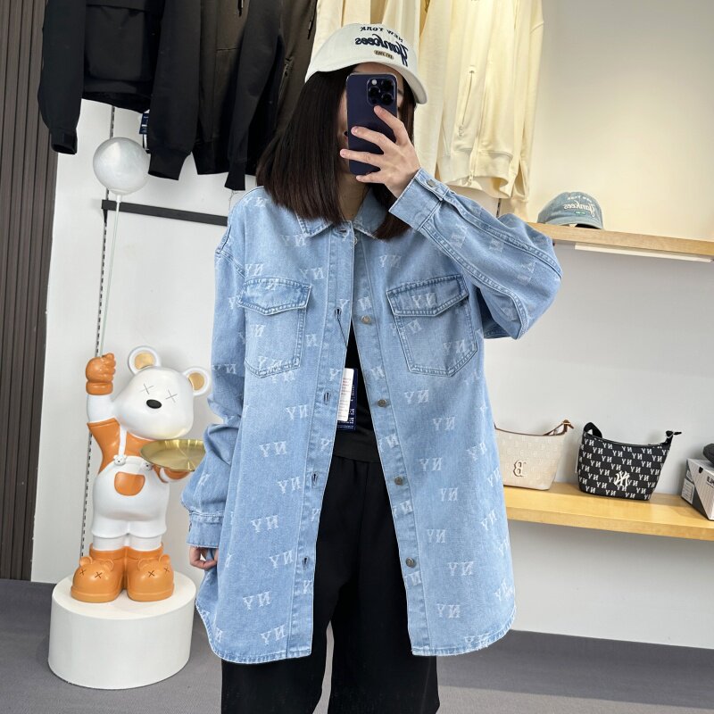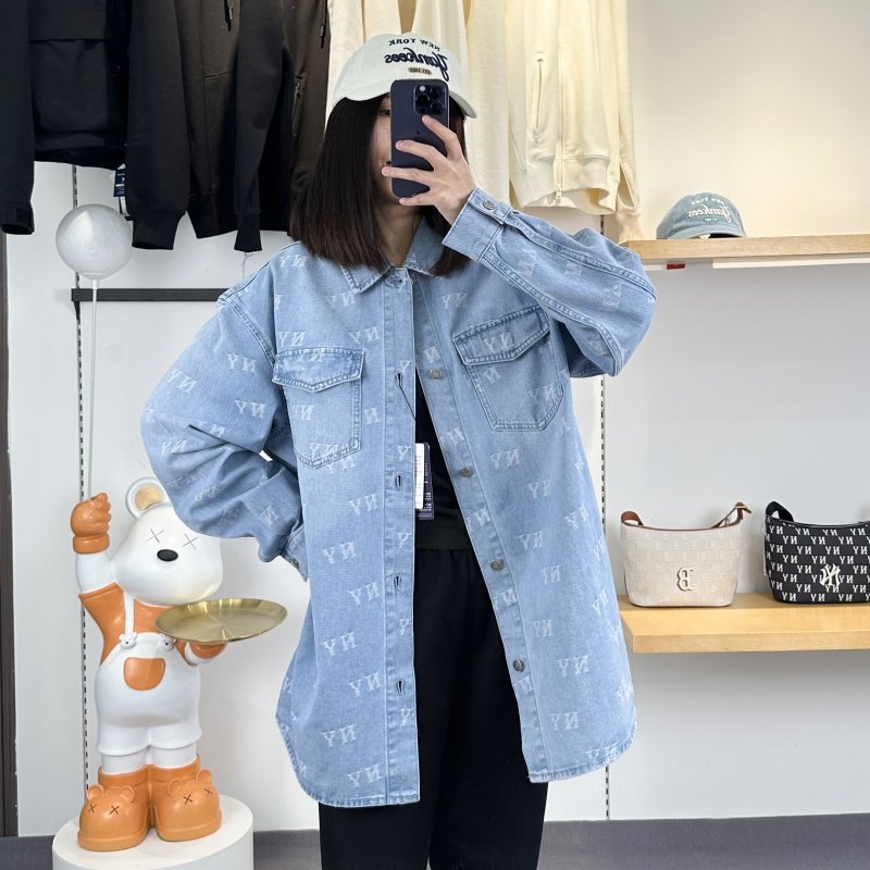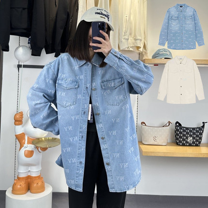 25新款MLB情侣牛仔外套男女NY复古老花满标宽松休闲衬衫3ADRM0151