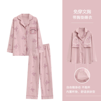 浪莎带胸垫睡衣女纯棉长袖套装